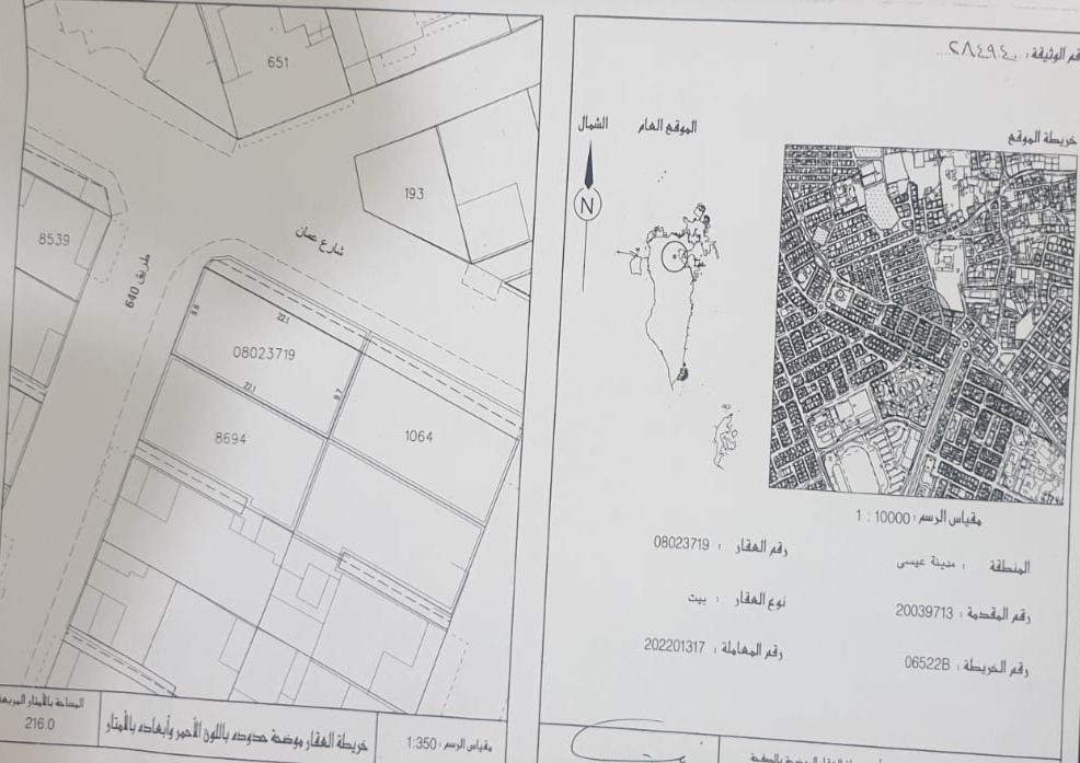 للبيع أرض سكنية في مدينة عيسى، على شارعين وزاوية، مع بناء قديم. المساحة 216 متر مربع. سعر القدم المربع 30107 دينار. التصنيف سكني MOH. مناطق مخصصة لمشاريع وزارة الاسكان. السعر الاجمالي 70000 دينار