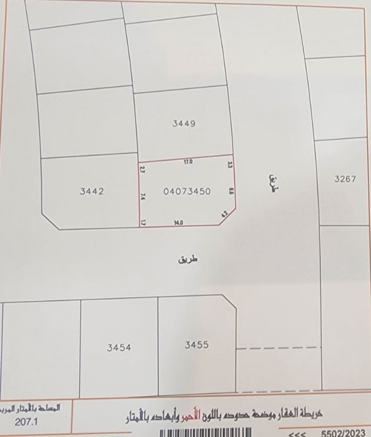 للبيع أرض سكنية في بو قوة على شارعين وزاوية، المساحة 207.1 متر مربع، التصنيف سكني RHA، السعر 83595 دينار