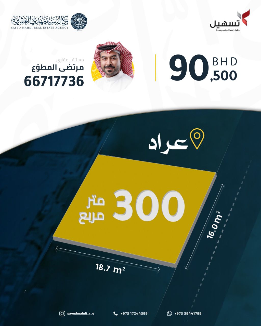 للبيع: أرض سكنية في منطقة عراد، مساحتها 300 متر مربع، مصنفة RA، على شارع. السعر الإجمالي 90,500 دينار بحريني فقط. لمزيد من التفاصيل، اتصل بالوسيط العقاري المعتمد مرتضى المطوع من وكالة سيد مهدي العقارية، RERA SA 202307/1206.