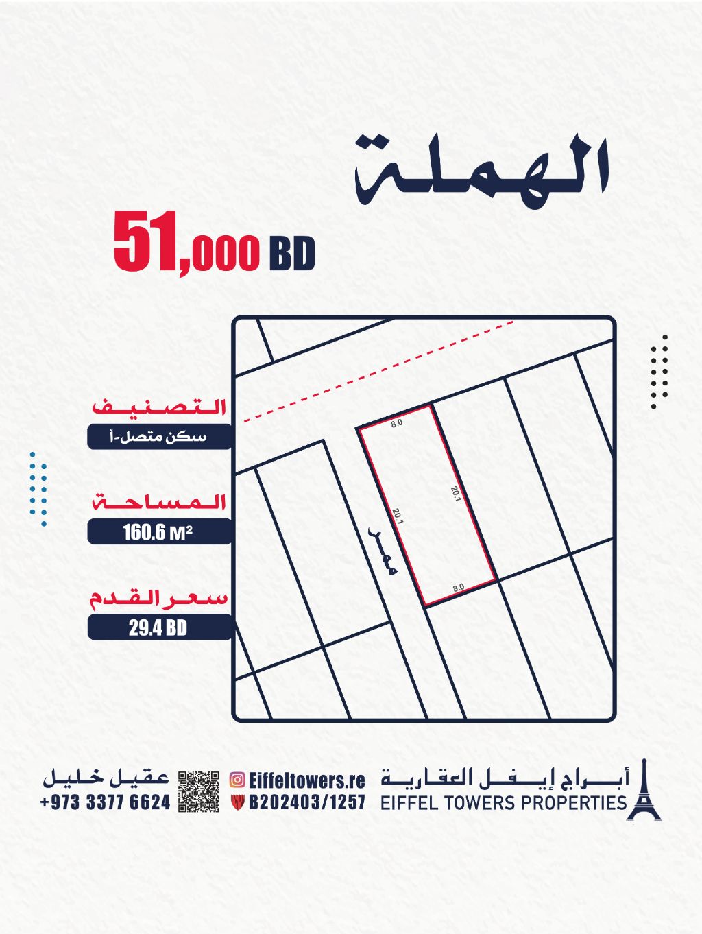 شركة أبراج أيفل العقارية تقدم للبيع أرضاً في الهملة بمساحة 160.6 متر مربع، مصنفة كسكني متصل (RHA)، بسعر 29.4 دينار بحريني للقدم المربع وسعر إجمالي 51,000 دينار بحريني. للتواصل، عقيل خليل.