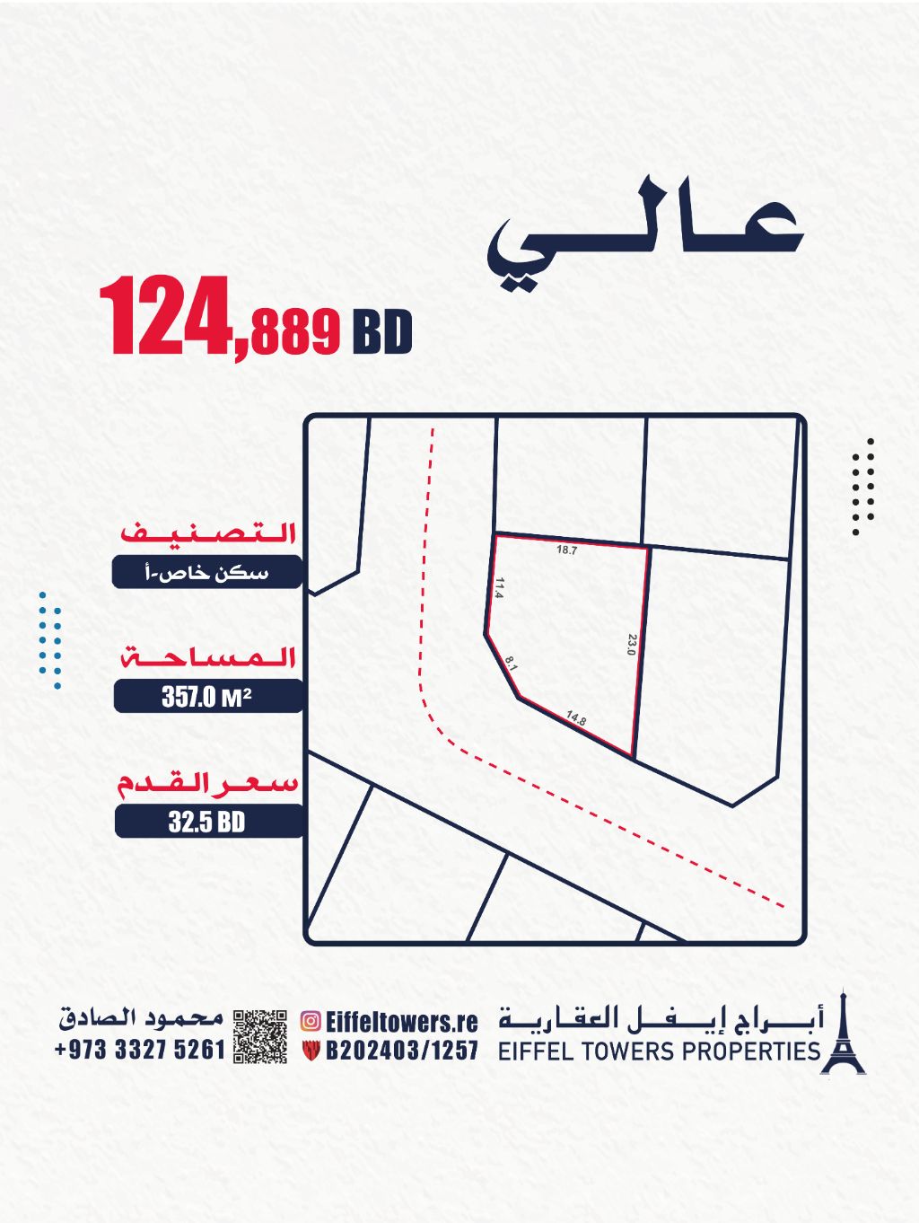 شركة أبراج أيفل العقارية تقدم للبيع أرض عالية المساحة 357 متر مربع، مصنفة كسكن خاص (أ RA)، بسعر القدم 32.5 دينار بحريني والسعر الإجمالي 124,889 دينار بحريني. للتواصل: محمود الصادق.