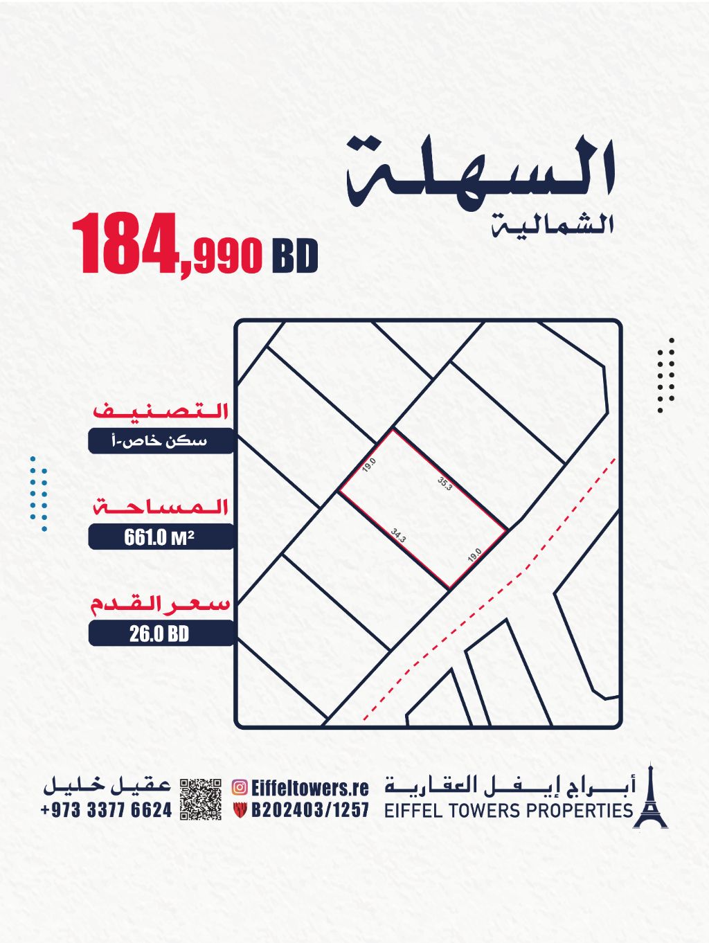 شركة أبراج أيفل العقارية تقدم للبيع أرضاً في السهلة الشمالية. المساحة 661 متر مربع، مصنفة كسكن خاص (أ RA). سعر القدم المربع 26 دينار بحريني، والسعر الإجمالي 184,990 دينار بحريني. للتواصل، اتصل بعقيل خليل.