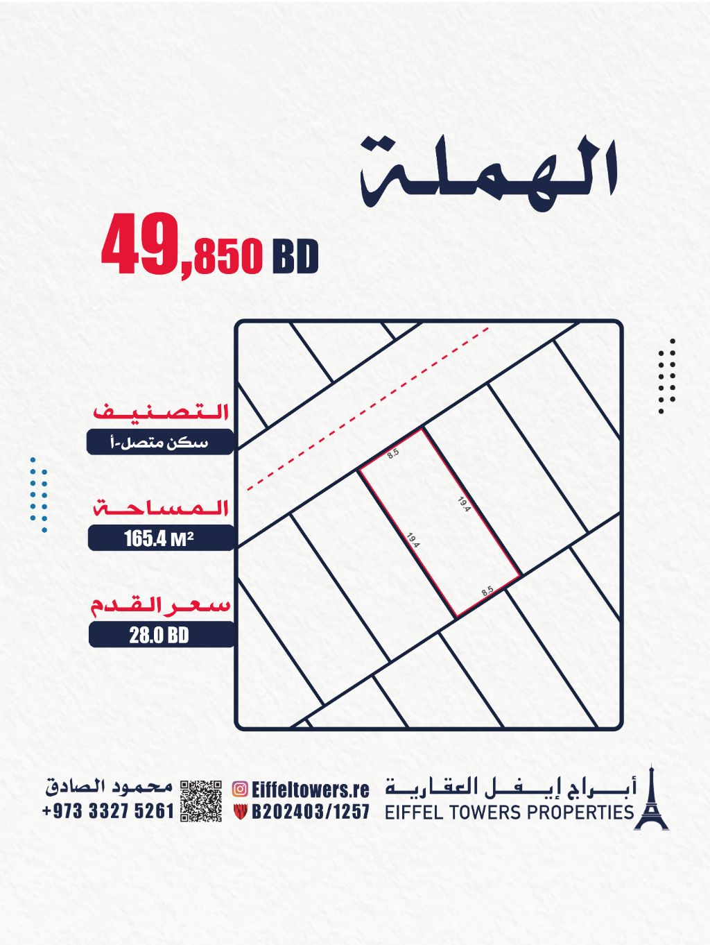 شركة أبراج أيفل العقارية تقدم للبيع أرضاً في الهملة بمساحة 165.4 متر مربع، مصنفة كسكني متصل (RHA). سعر القدم المربع هو 28 ديناراً بحرينياً، والسعر الإجمالي هو 49,850 ديناراً بحرينياً. للتواصل، اتصل بمحمود الصادق.