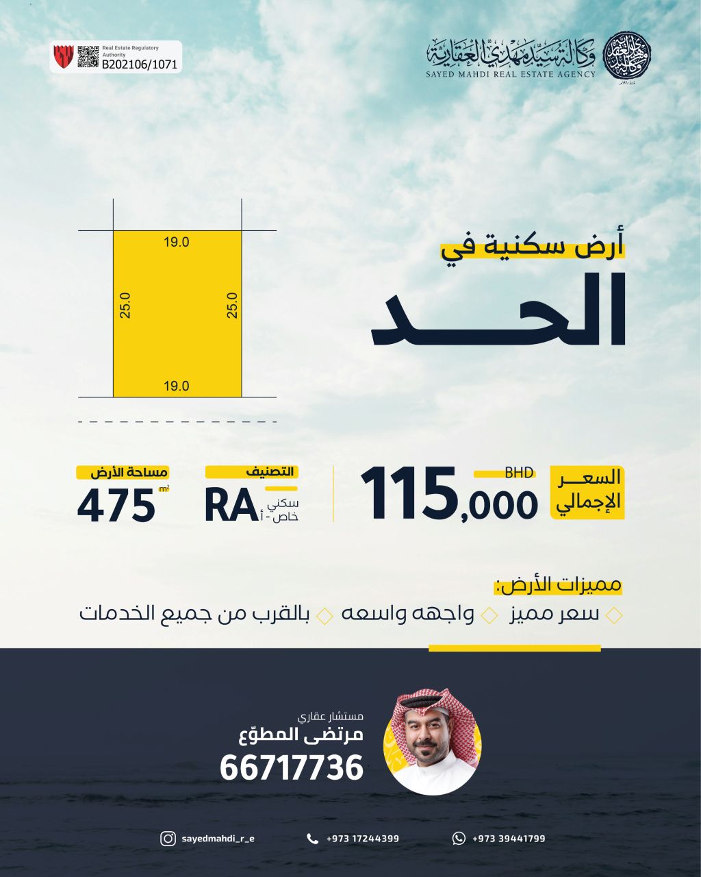 للبيع: أرض سكنية في منطقة الحد، تقع بالقرب من مدرسة العروبة الابتدائية للبنات. التصنيف: RA. سعر القدم المربع: 22.5 دينار. مساحة الأرض: 475 متر مربع. عدد الشوارع: 1. السعر الإجمالي: 115,000 دينار بحريني. لمزيد من التفاصيل، اتصل بالوسيط العقاري المعتمد مرتضى المطوع، من وكالة سيد مهدي العقارية (sayedmahdi - r e mortadha - smre).