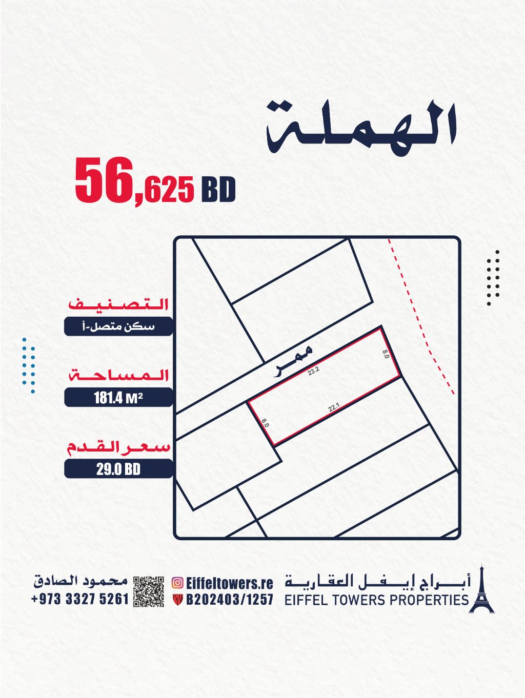 شركة أبراج أيفل العقارية تقدم للبيع أرضاً في الهملة بمساحة 181.4 متر مربع، مصنفة كسكني متصل (RHA). سعر القدم المربع هو 29 دينار بحريني، والسعر الإجمالي هو 56,625 دينار بحريني. للتواصل، اتصل بمحمود الصادق.