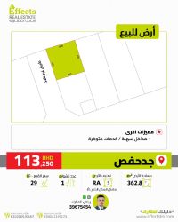 للبيع: أرض سكنية تقع في جدحفص. مواصفات الأرض: المساحة 362.8 متر مربع، الشوارع - 1، التصنيف RA. ميزات إضافية: مداخل سهلة وخدمات متوفرة. سعر القدم المربع: 29 دينار. السعر الإجمالي: 113,250 دينار بحريني.
