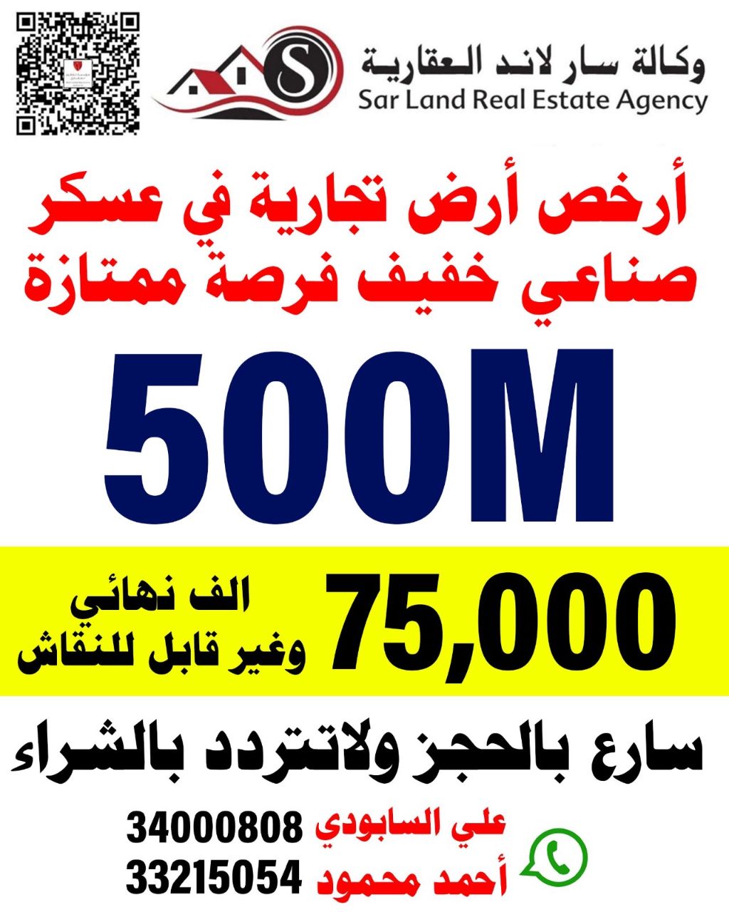 أرض تجارية فلتة في عسكر مساحة 500 متر، السعر 75 ألف دينار نهائي.