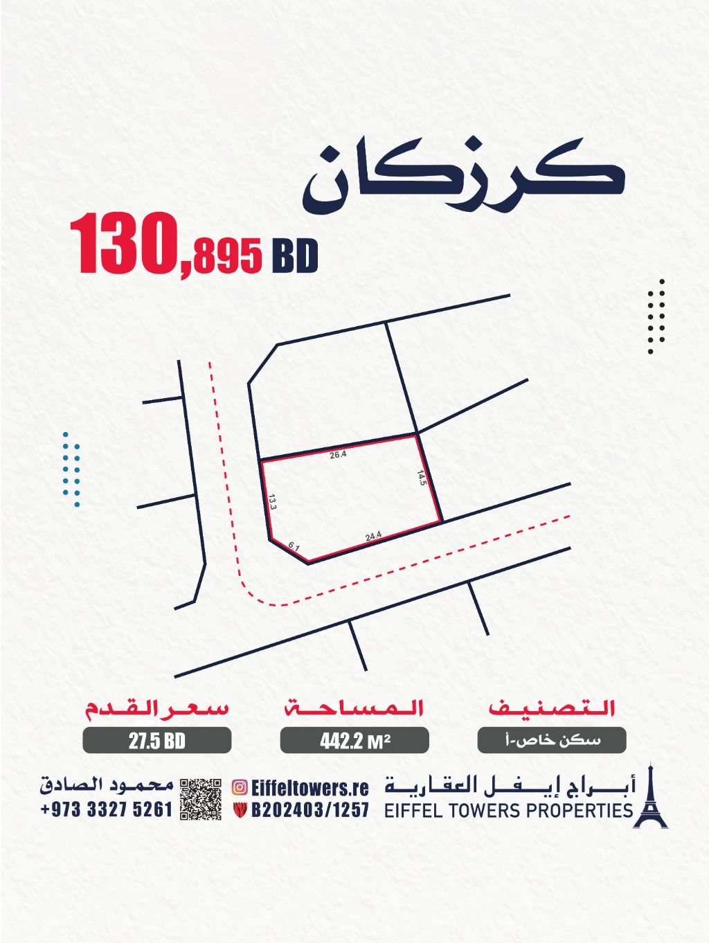 شركة أبراج إيفل العقارية تعرض للبيع أرضاً في كرزكان بمساحة 442.2 متر مربع، مصنفة كسكن خاص (أ RA). سعر القدم المربع هو 27.5 دينار بحريني، والسعر الإجمالي هو 130,895 دينار بحريني. للتواصل، اتصل بمحمود الصادق عبر eiffeltowers.re. هذا وسيط معتمد من قبل مؤسسة التنظيم العقاري برقم الترخيص B202403/1257.
