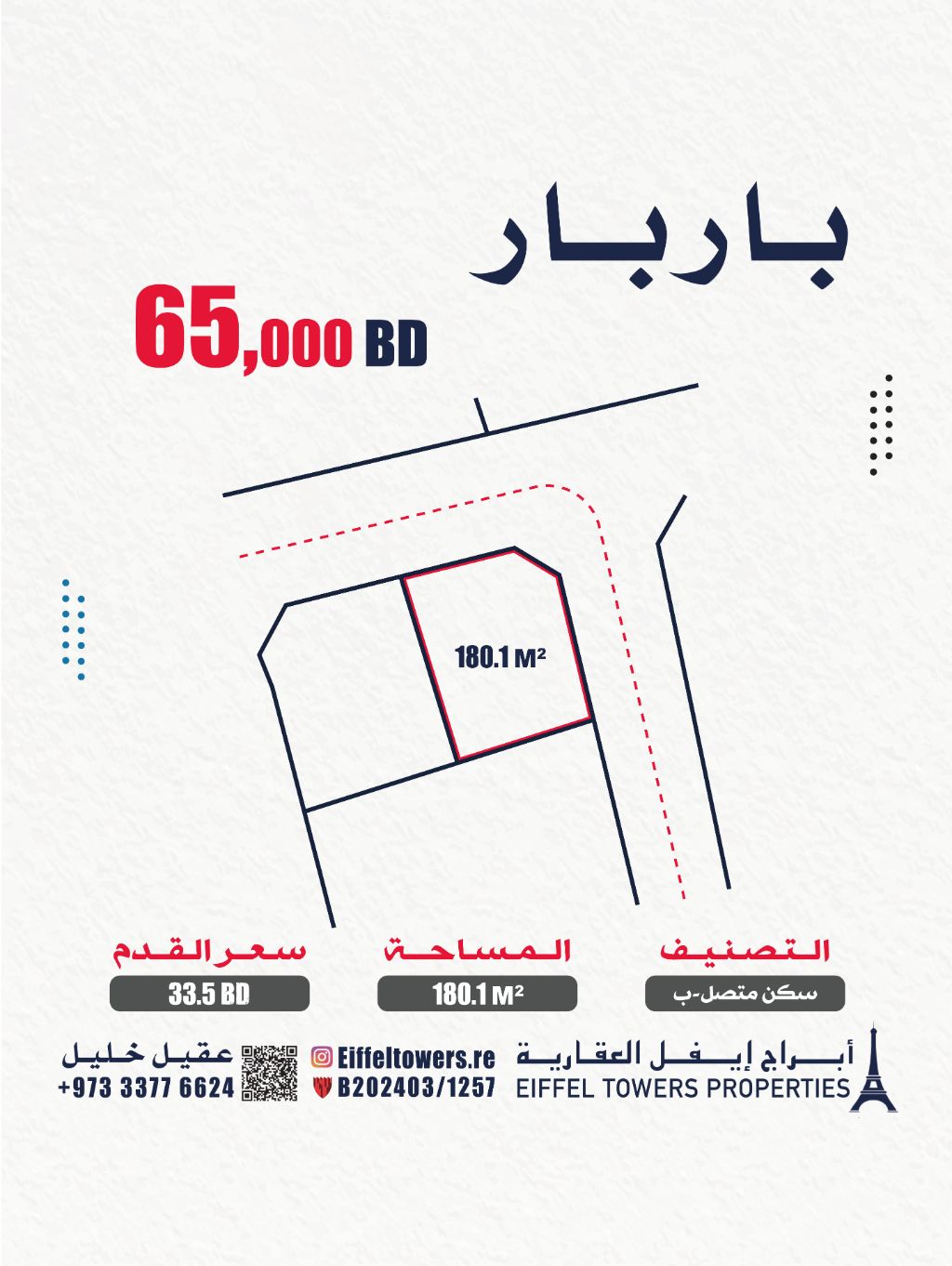شركة أبراج إيفل العقارية تعرض للبيع أرضاً في باربار بمساحة 180.1 متر مربع، مصنفة كسكن متصل (RHB). سعر القدم المربع هو 33.5 دينار بحريني، والسعر الإجمالي هو 65,000 دينار بحريني. للتواصل، اتصل بمحمود الصادق عبر eiffeltowers.re. أبراج إيفل وسيط معتمد من قبل مؤسسة التنظيم العقاري برقم الترخيص B202403/1257.