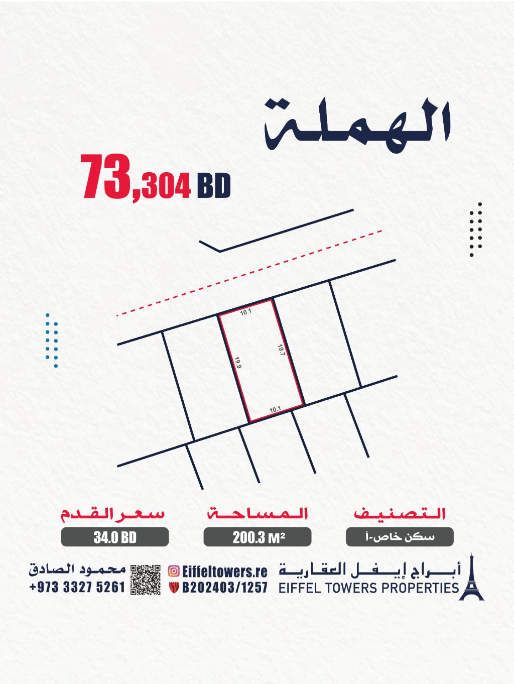 شركة أبراج أيفل العقارية تعرض للبيع أرضاً في الهملة بمساحة 200.3 متر مربع، مصنفة كسكن خاص (أ RA). سعر القدم المربع هو 34 دينار بحريني، والسعر الإجمالي هو 73,304 دينار بحريني. للتواصل، اتصل بمحمود الصادق عبر eiffeltowers.re. الشركة وسيط معتمد من قبل مؤسسة التنظيم العقاري برقم الترخيص B202403/1257.