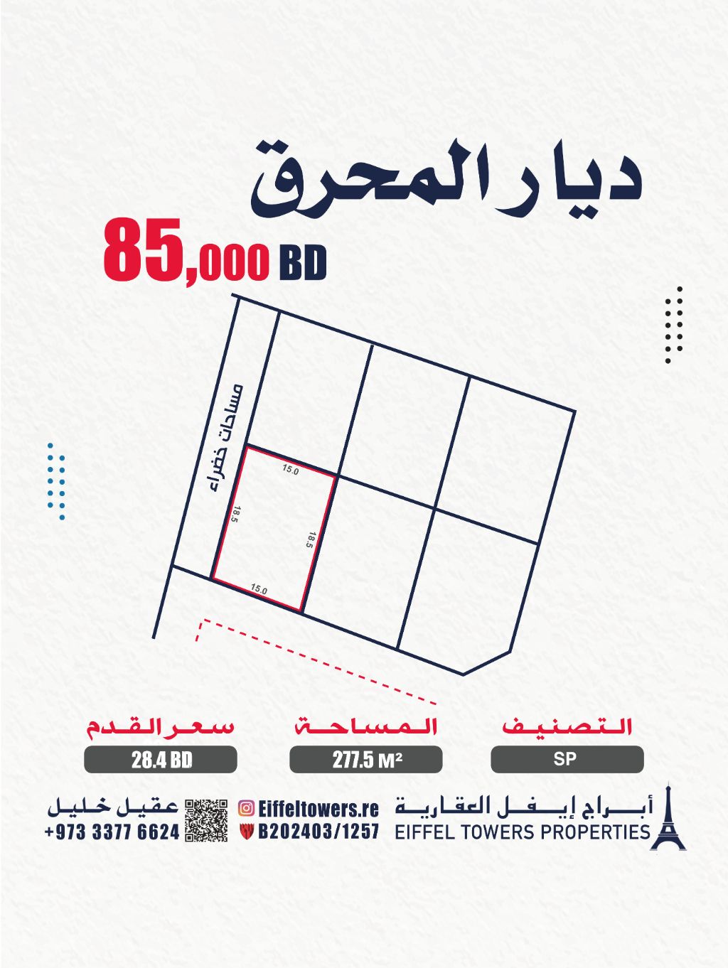 شركة أبراج أيفل العقارية تعرض للبيع أرضاً في ديار المحرق بمساحة 277.5 متر مربع. التصنيف: مناطق المشروعات ذات الطبيعة الخاصة - SP. سعر القدم المربع: 28.4 دينار بحريني. السعر الإجمالي: 85,000 دينار بحريني. للتواصل: عقيل خليل. eiffeltowers.re وسيط معتمد من قبل مؤسسة التنظيم العقاري، رقم الترخيص B202403/1257.