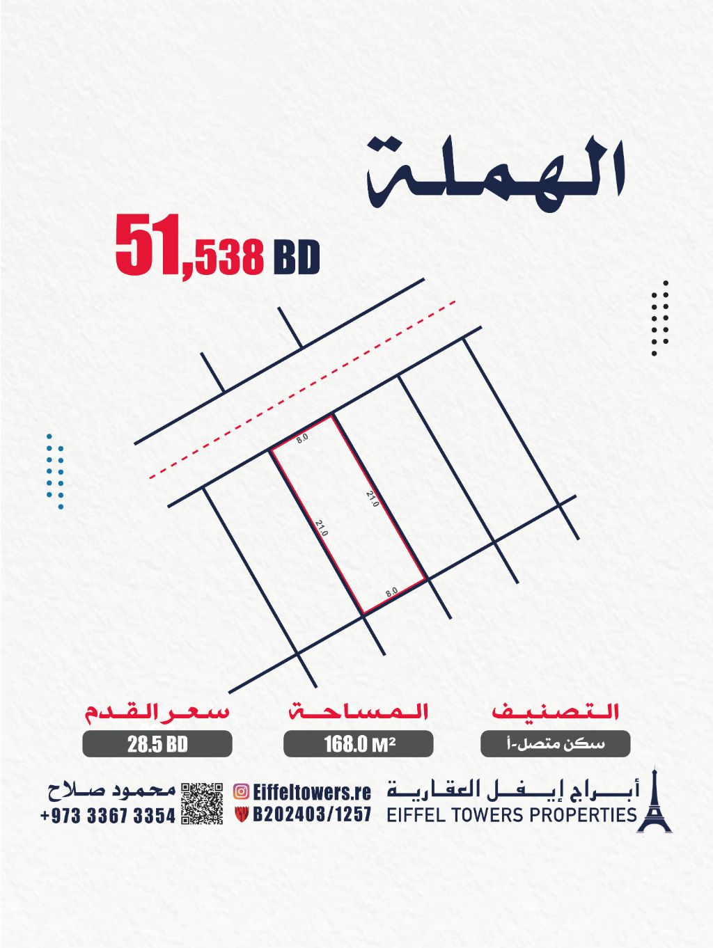 شركة أبراج أيفل العقارية تعرض للبيع أرضاً في الهملة، فيس 4، بمساحة 168 متراً مربعاً. التصنيف سكني متصل (أرها). سعر القدم المربع 28.5 دينار بحريني، والسعر الإجمالي 51,538 دينار بحريني. للتواصل، اتصل بمحمود صلاح على eiffeltowers-re أو eiffeltowers.re. الشركة وسيط معتمد من قبل مؤسسة التنظيم العقاري، برقم الترخيص B202403/1257.