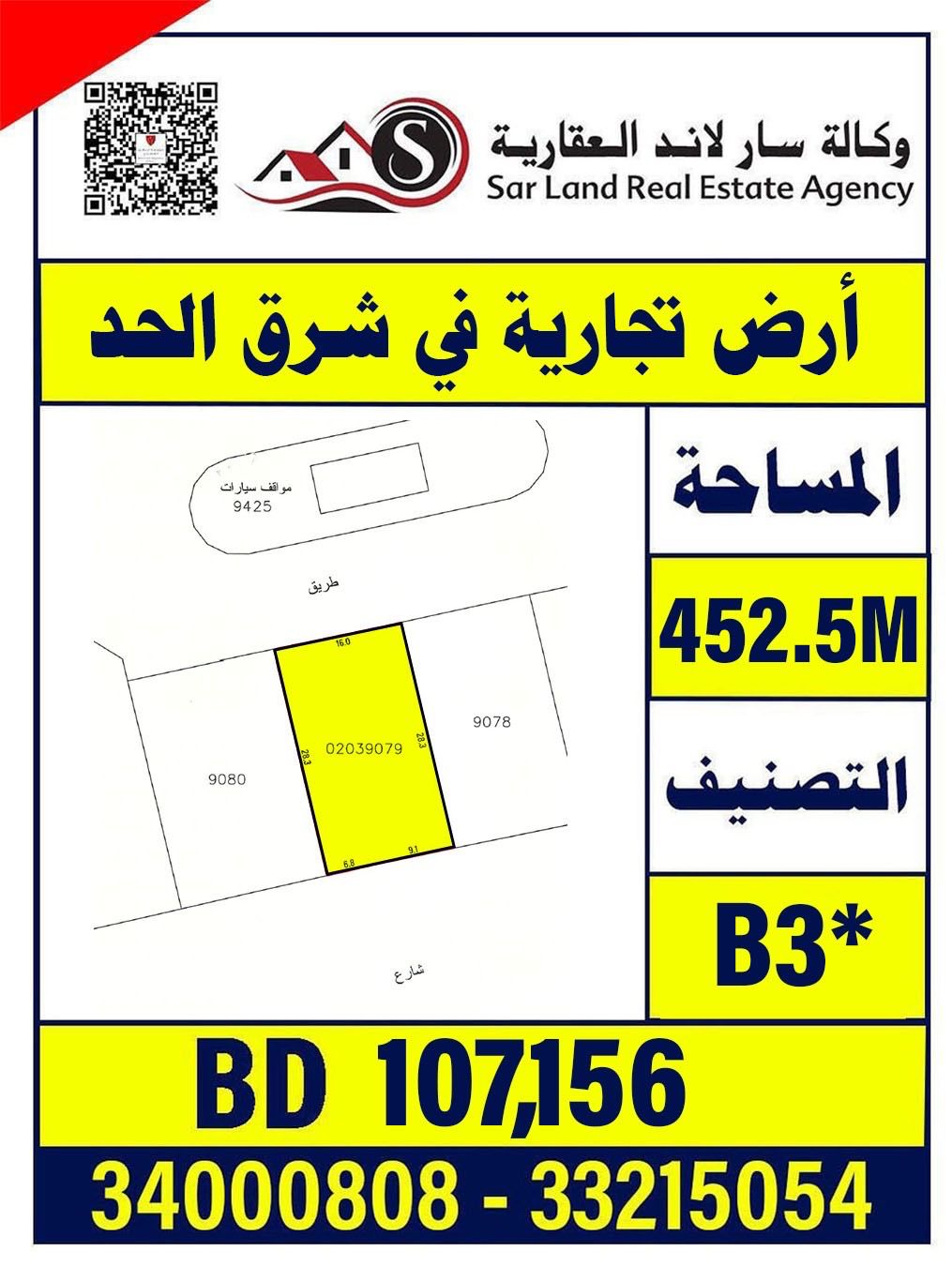 أرض تجارية في شرق الحد، موقع ممتاز، بنية تحتية متكاملة، مساحة 452.5 متر، تصنيف B3، السعر 107156 ألف دينار، وكالة سار لاند العقارية