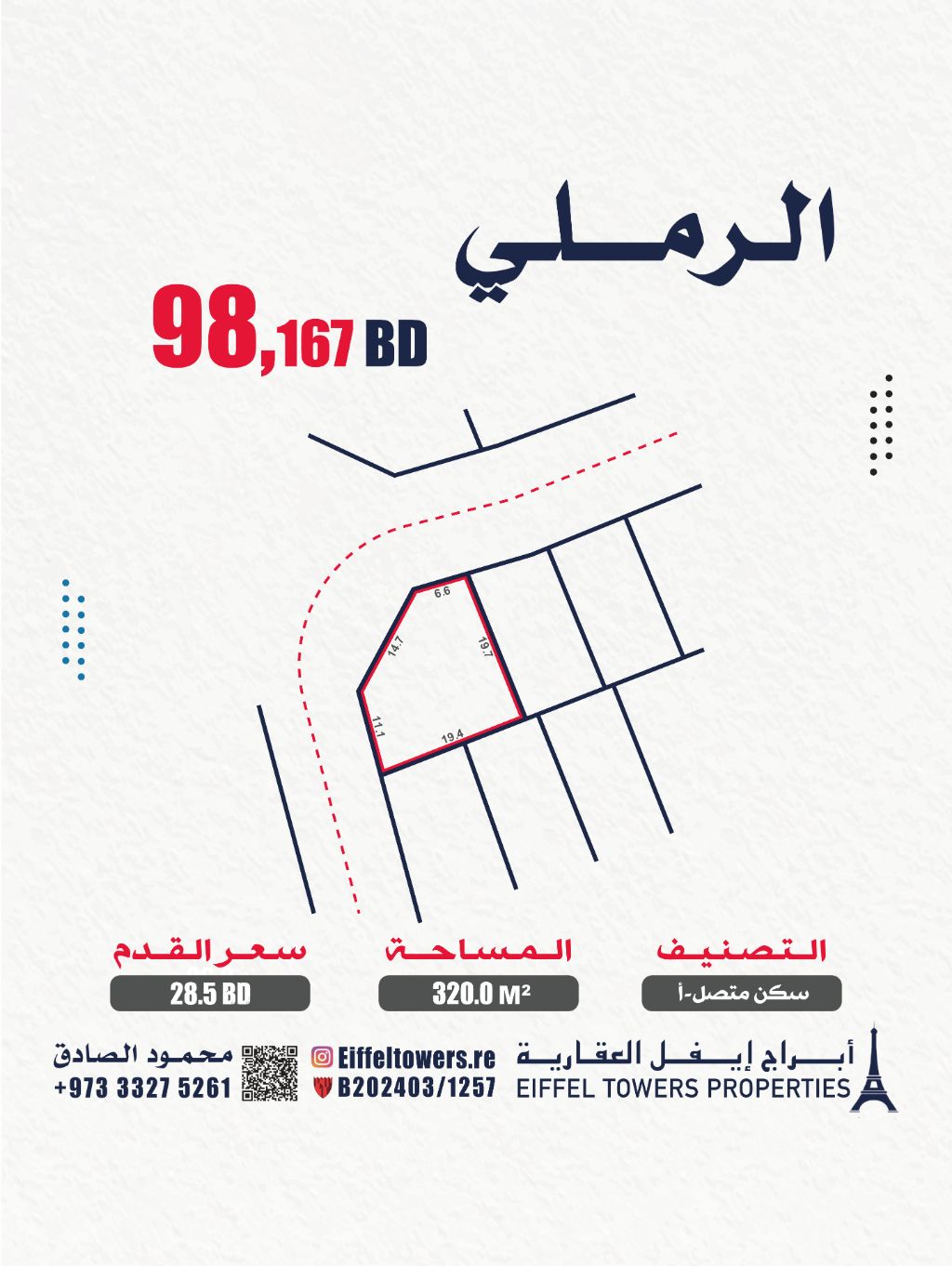 شركة أبراج أيفل العقارية تعرض للبيع أرض في منطقة الرملي بمساحة 320 متر مربع، مصنفة سكنية متصلة (أ RHA). سعر القدم المربع 28.5 دينار بحريني، السعر الإجمالي 98,167 دينار بحريني. للتواصل: محمود الصادق، eiffeltowers-re، eiffeltowers.re. وسيط مرخص ومعتمد من قبل مؤسسة التنظيم العقاري، رقم الترخيص B202403/1257.
