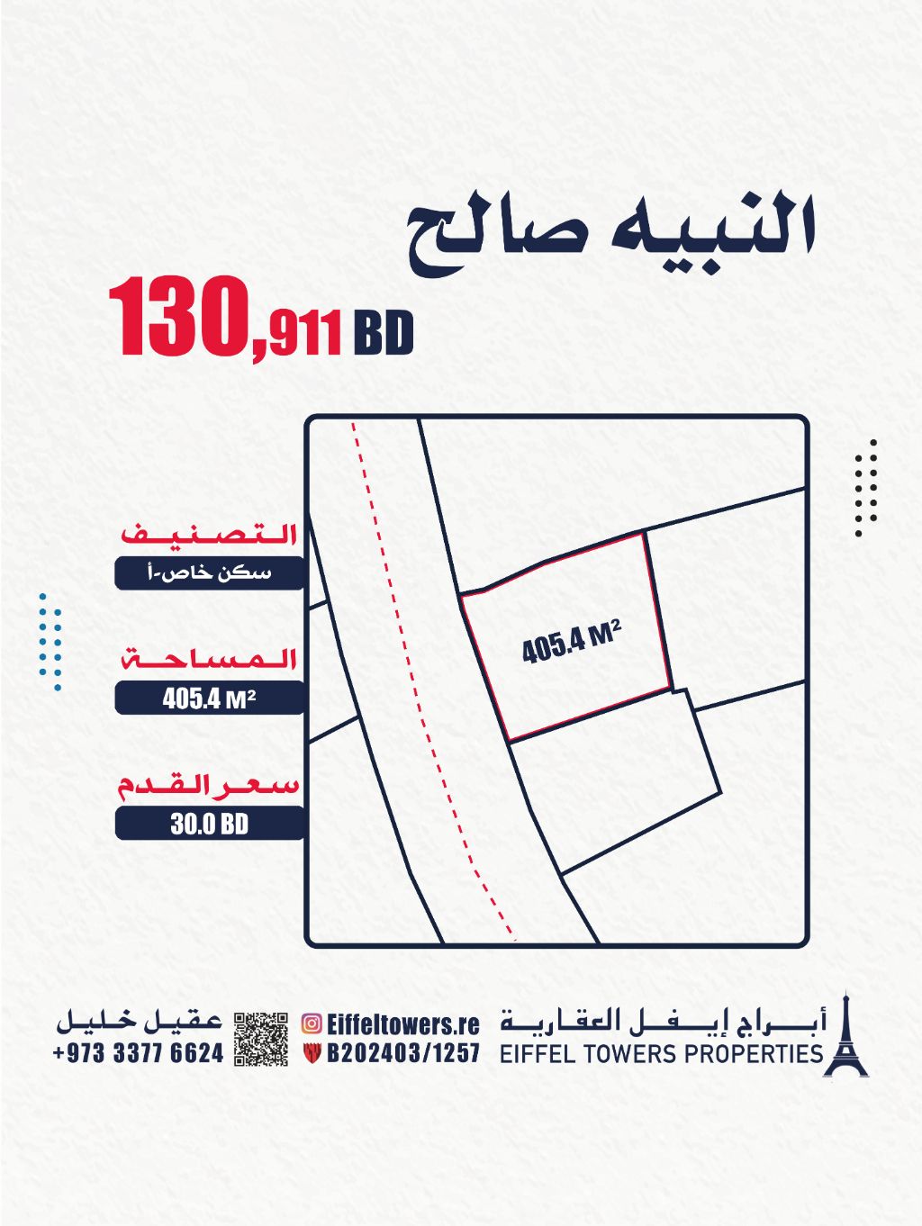 شركة أبراج أيفل العقارية تعرض للبيع أرضاً في النبيه صالح بمساحة 405.4 متر مربع، مصنفة كسكن خاص (أ RA). سعر القدم المربع 30 دينار بحريني، والسعر الإجمالي 130,911 دينار بحريني. للتواصل: عقيل خليل، eiffeltowers-re، eiffeltowers.re. الشركة وسيط مرخص ومعتمد من قبل مؤسسة التنظيم العقاري، رقم الترخيص B202403/1257.