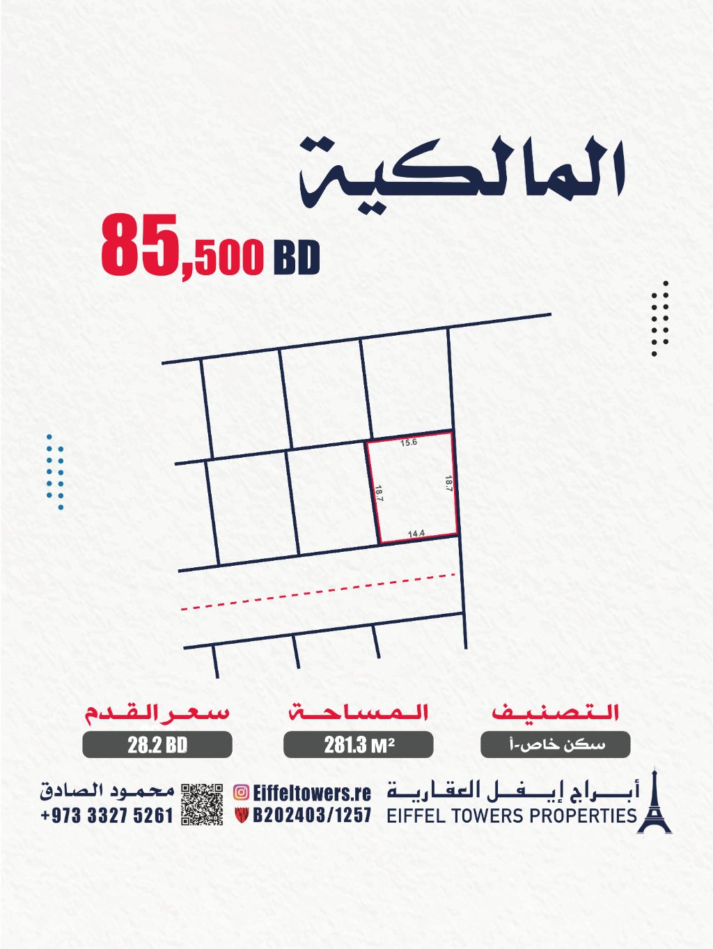 شركة أبراج أيفل العقارية تعرض للبيع أرضاً في المالكية بمساحة 281.3 متر مربع، مصنفة كسكن خاص (أ RA). سعر القدم المربع 28.2 دينار بحريني، والسعر الإجمالي 85,500 دينار بحريني. للتواصل: محمود الصادق، eiffeltowers.re، eiffeltowers.re. وسيط مرخص ومعتمد من قبل مؤسسة التنظيم العقاري، رقم الترخيص B202403/1257.