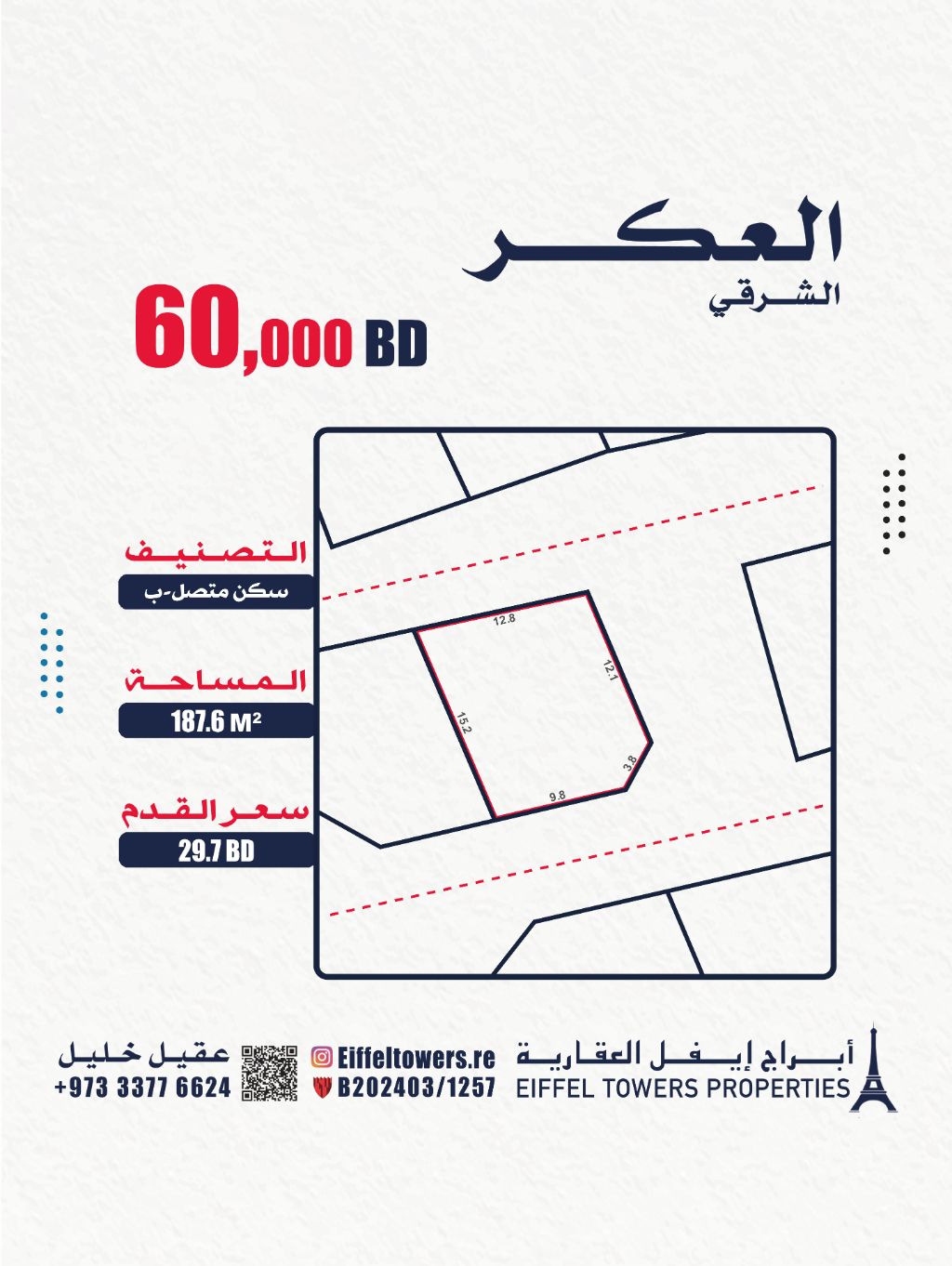 شركة أبراج أيفل العقارية تعرض للبيع أرضاً في العكر الشرقي. المساحة 187.6 متر مربع، مصنفة كسكن متصل (مع RHB). سعر القدم المربع 29.7 دينار بحريني، والسعر الإجمالي 60,000 دينار بحريني. للتواصل: عقيل خليل، eiffeltowers.re، eiffeltowers.re. الشركة وسيط مرخص ومعتمد من قبل مؤسسة التنظيم العقاري، رقم الترخيص B202403/1257.