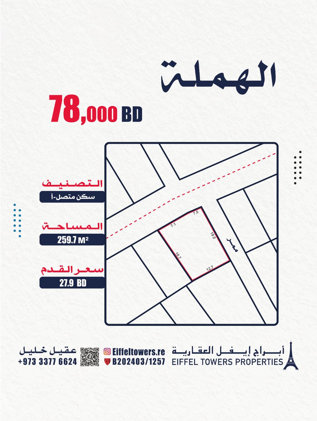 شركة أبراج أيفل العقارية تعرض للبيع أرضاً في الهملة بمساحة 259.7 متر مربع. التصنيف: سكني متصل (RHA). سعر القدم المربع: 27.9 دينار بحريني. السعر الإجمالي: 78,000 دينار بحريني. للتواصل: عقيل خليل. شركة أبراج أيفل العقارية وسيط معتمد من قبل مؤسسة التنظيم العقاري، رقم الترخيص B202403/1257.
