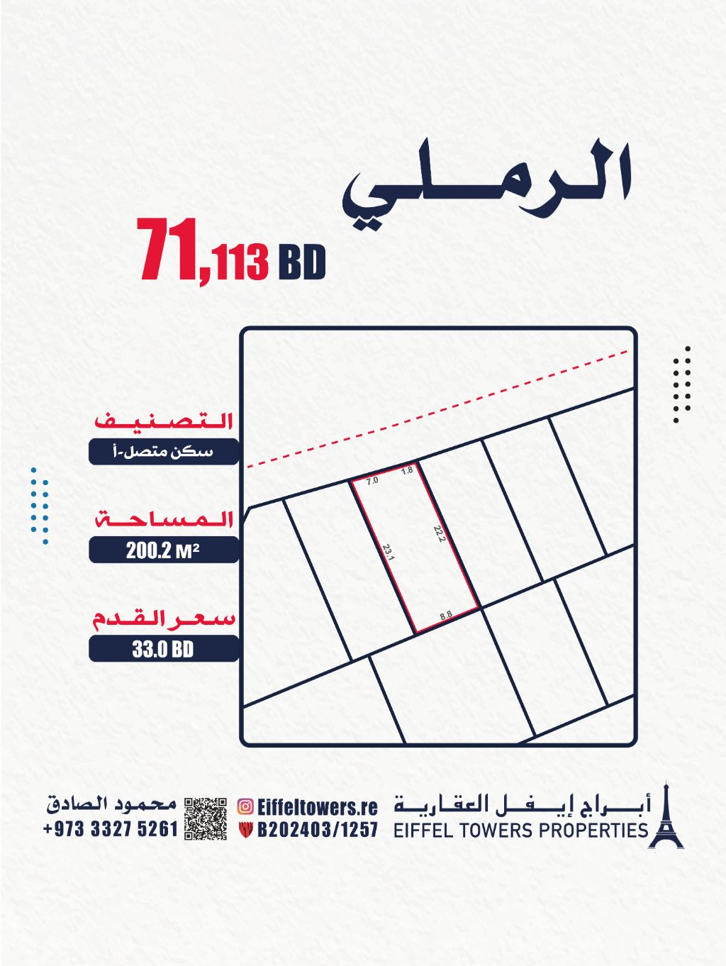 شركة أبراج أيفل العقارية تعرض للبيع أرض في منطقة الرملي. المساحة 200.2 متر مربع التصنيف سكن متصل ( أ RHA) سعر القدم 33 دينار بحريني والسعر الاجمالي 71113 دينار بحريني. للتواصل محمود الصادق، eiffeltowers. re، eiffeltowers. re. الشركة وسيط معتمد من قبل مؤسسة التنظيم العقاري، رقم الترخيص B202403 / 1257
