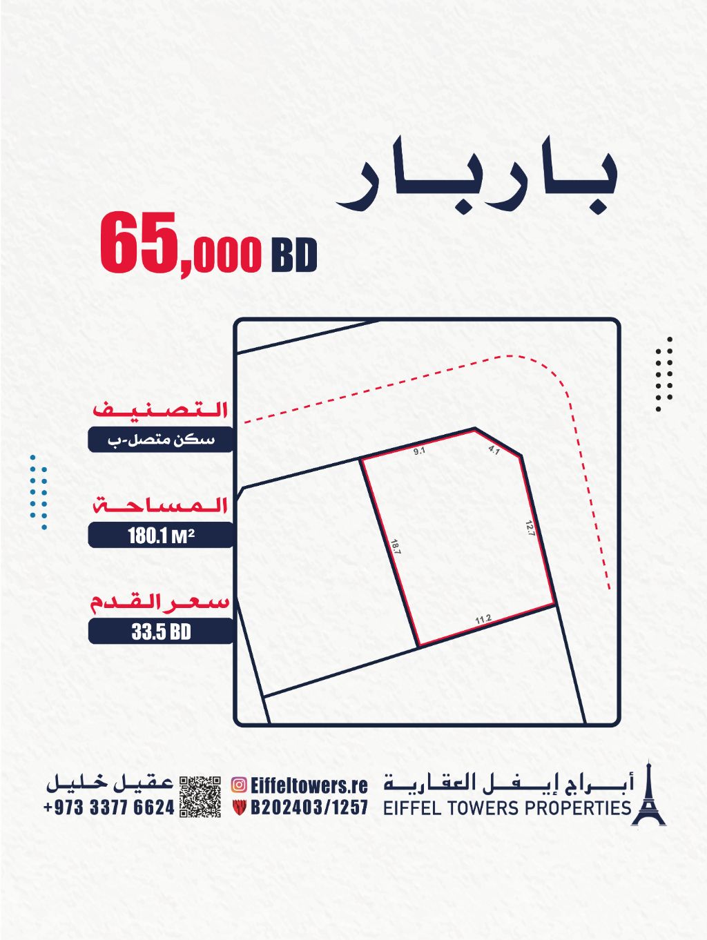 شركة أبراج أيفل العقارية تعرض للبيع أرضاً في باربار بمساحة 180.1 متر مربع، مصنفة كسكن متصل (مع RHB). سعر القدم 33.5 دينار بحريني، السعر الإجمالي 65,000 دينار بحريني. للتواصل: عقيل خليل، eiffeltowers.re، eiffeltowers.re، وسيط معتمد من قبل مؤسسة التنظيم العقاري، رقم الترخيص B202403/1257.