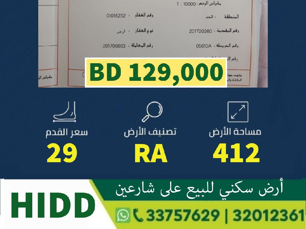 للبيع أرض في موقع مميز في الحد خلف مجمع لولؤ، تصنيف استثماري سكني RA، على شارعين. معلومات الأرض: المنطقة: الحد، التصنيف: RA، المساحة بالأمتار: 412.5 متر، المساحة بالأقدام: 4440.11 قدم، سعر القدم: 29 دينار بحريني، السعر الإجمالي: 129,000 دينار بحريني. للاتصال.