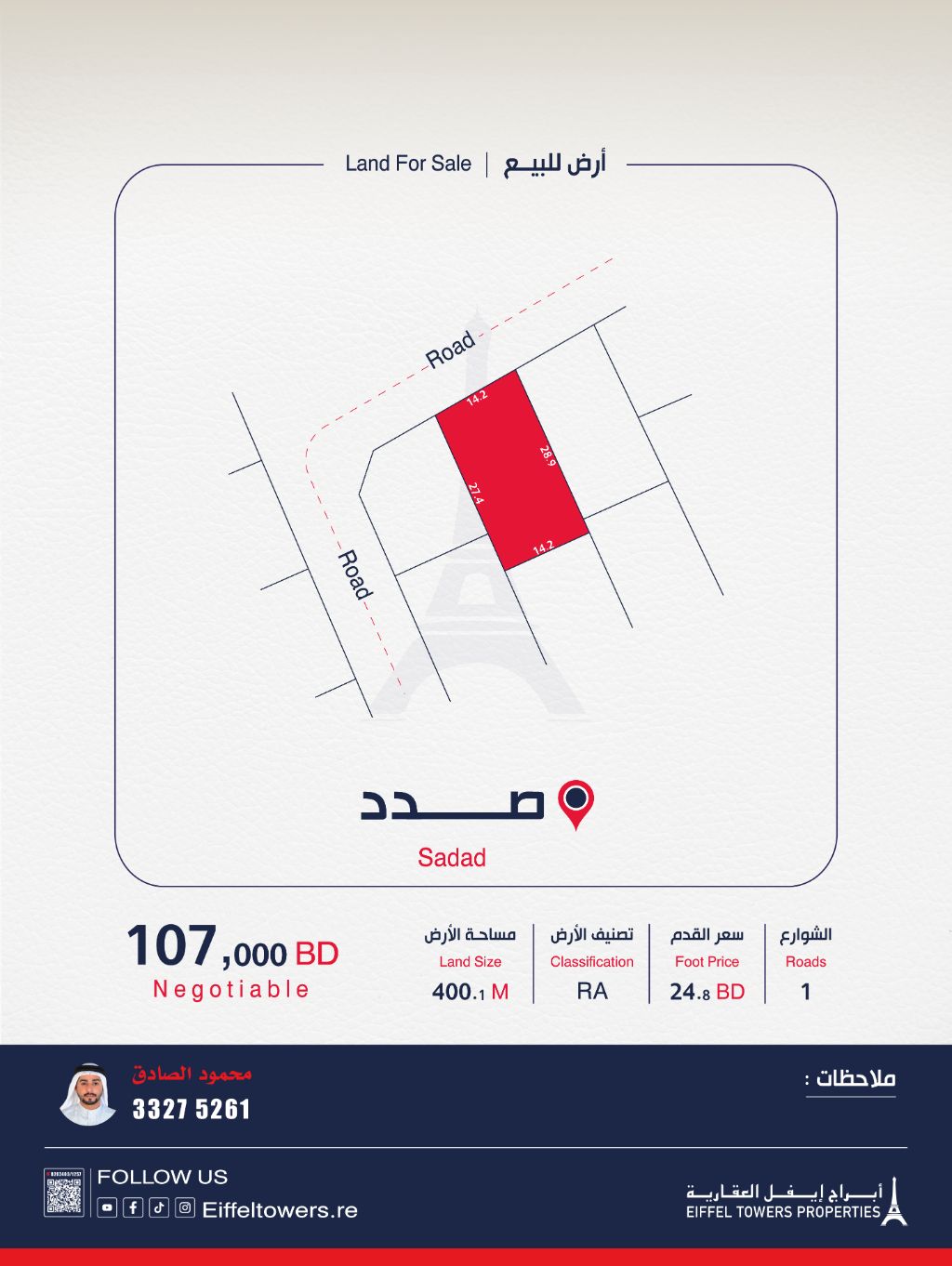 شركة أبراج أيفل العقارية تعرض للبيع أرضاً في صدد، مساحتها 400.1 متر مربع، مصنفة كسكن خاص (أ RA). سعر القدم المربع 24.8 دينار بحريني، السعر الإجمالي 107,000 دينار بحريني. للتواصل: محمود الصادق، eiffeltowers.re، eiffeltowers.re. وسيط مرخص ومعتمد من قبل مؤسسة التنظيم العقاري، رقم الترخيص B202403/1257.