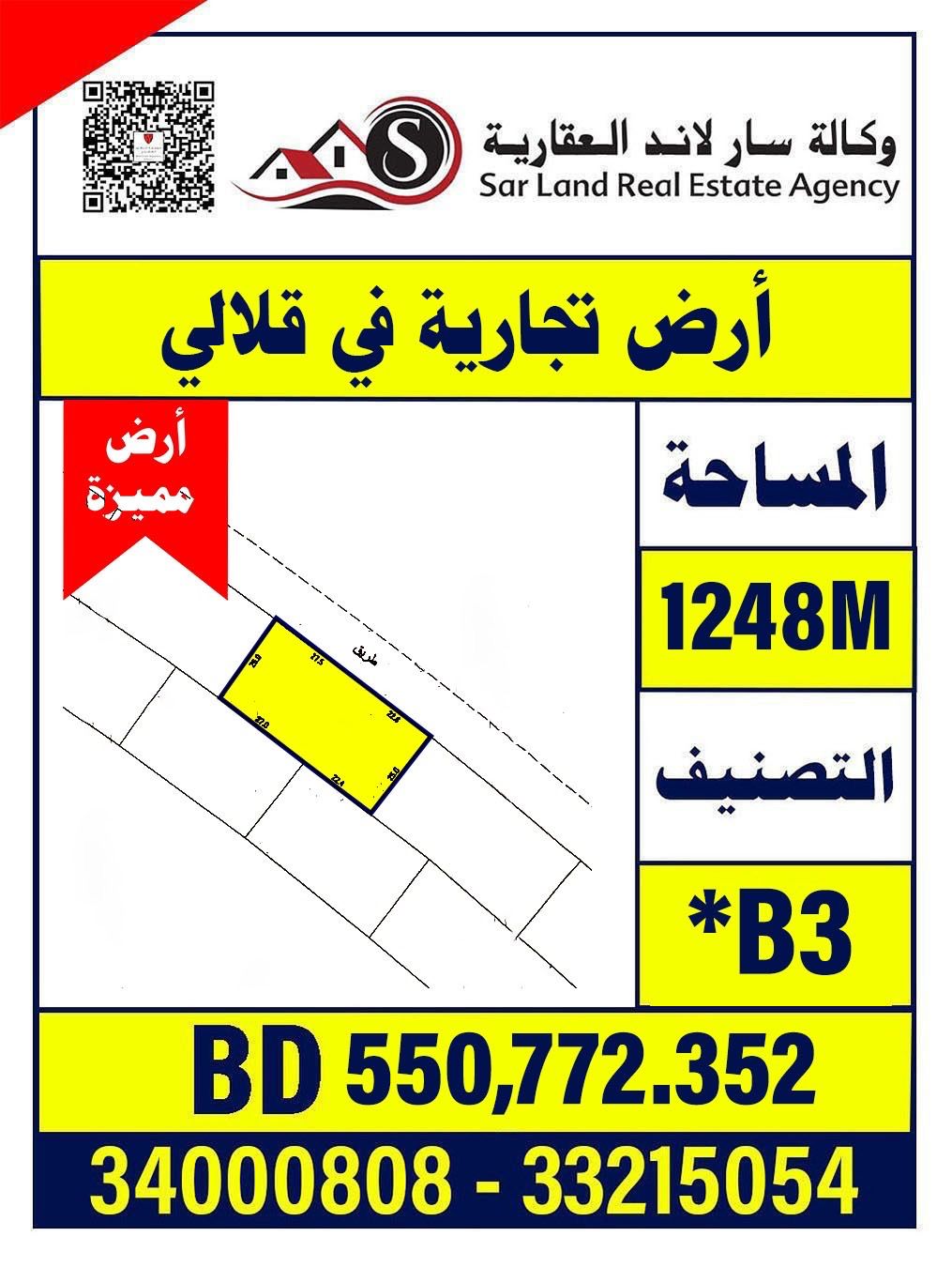 أرض تجارية في قلالي مساحة 1248 متر مربع تصنيف B3 السعر 550,772 ألف.