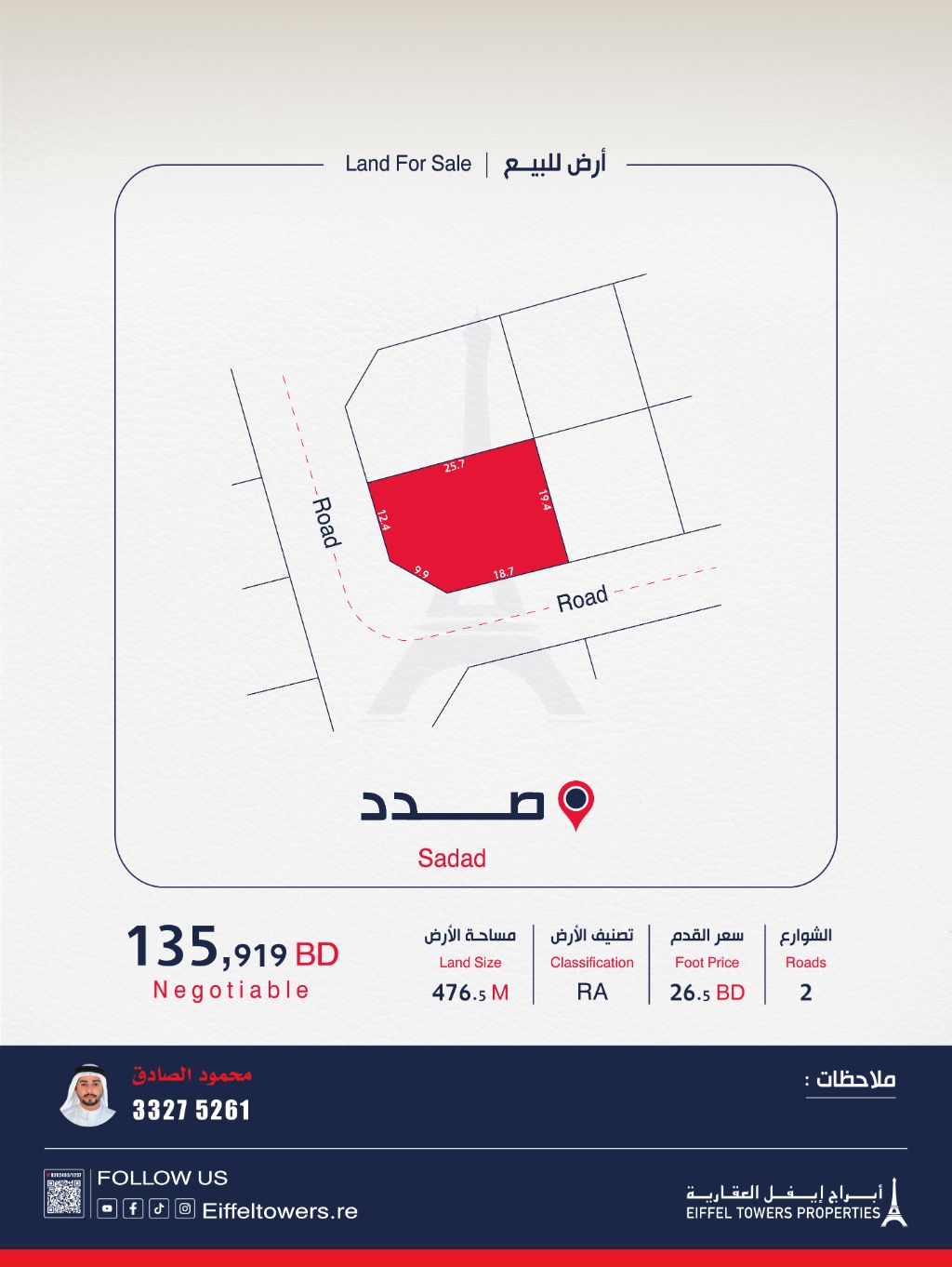 شركة أبراج أيفل العقارية تعرض للبيع أرضاً في صدد بمساحة 476.5 متر مربع. التصنيف: سكن خاص (أ RA). سعر القدم المربع: 26.5 دينار بحريني. السعر الإجمالي: 135,919 دينار بحريني. للتواصل: محمود الصادق. شركة أبراج أيفل العقارية وسيط معتمد من قبل مؤسسة التنظيم العقاري، رقم الترخيص B202403/1257.