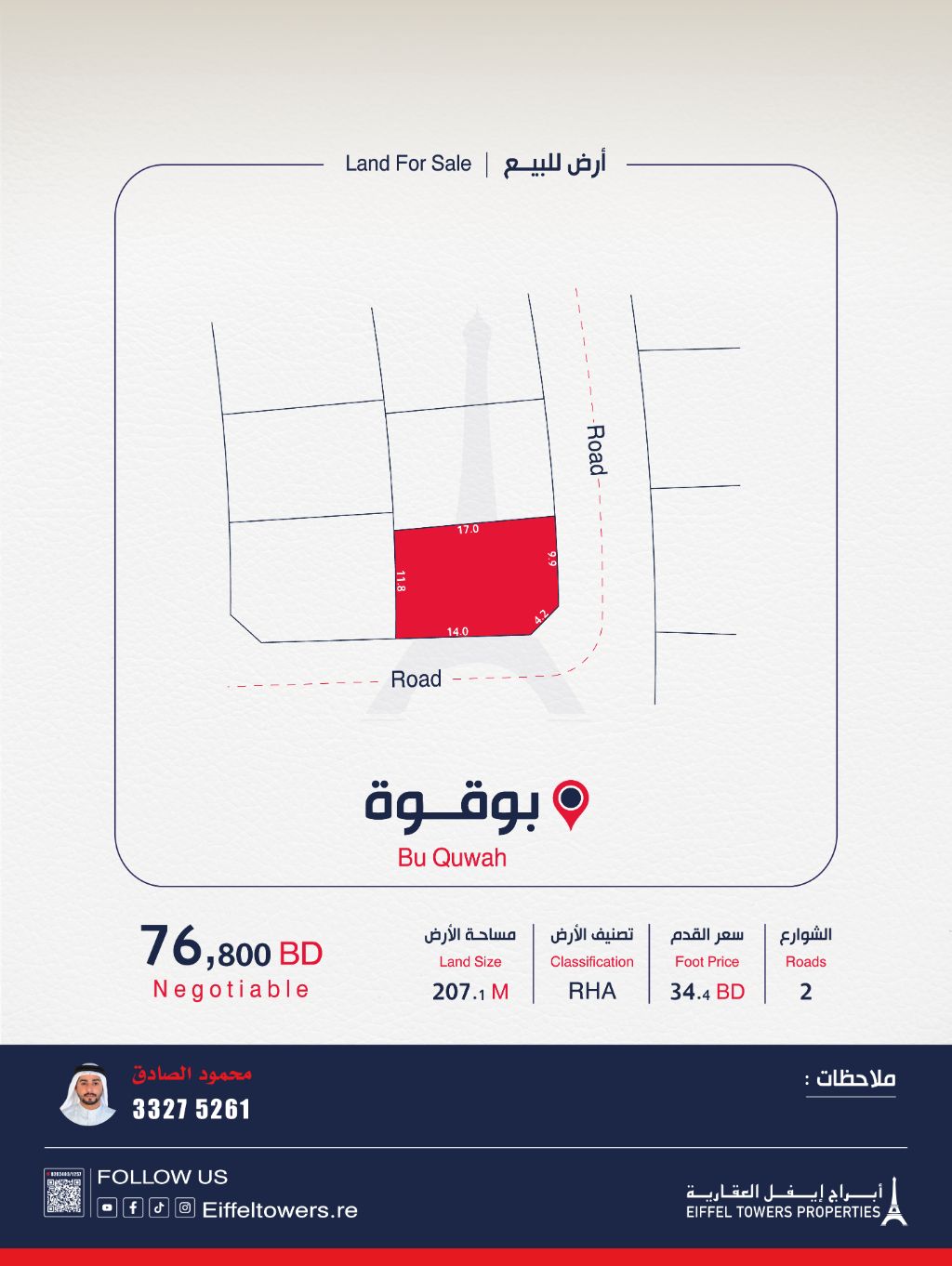 شركة أبراج أيفل العقارية تعرض للبيع قطعة أرض في أبو قوة. المساحة 207.1 متر مربع، التصنيف سكني متصل (أ RHA). سعر القدم المربع 34.4 دينار بحريني، والسعر الإجمالي 76,800 دينار بحريني، للكاش فقط. للتواصل: محمود الصادق، eiffeltowers.re، eiffeltowers.re. الوسيط مرخص من قبل مؤسسة التنظيم العقاري، رقم الترخيص B202403/1257.