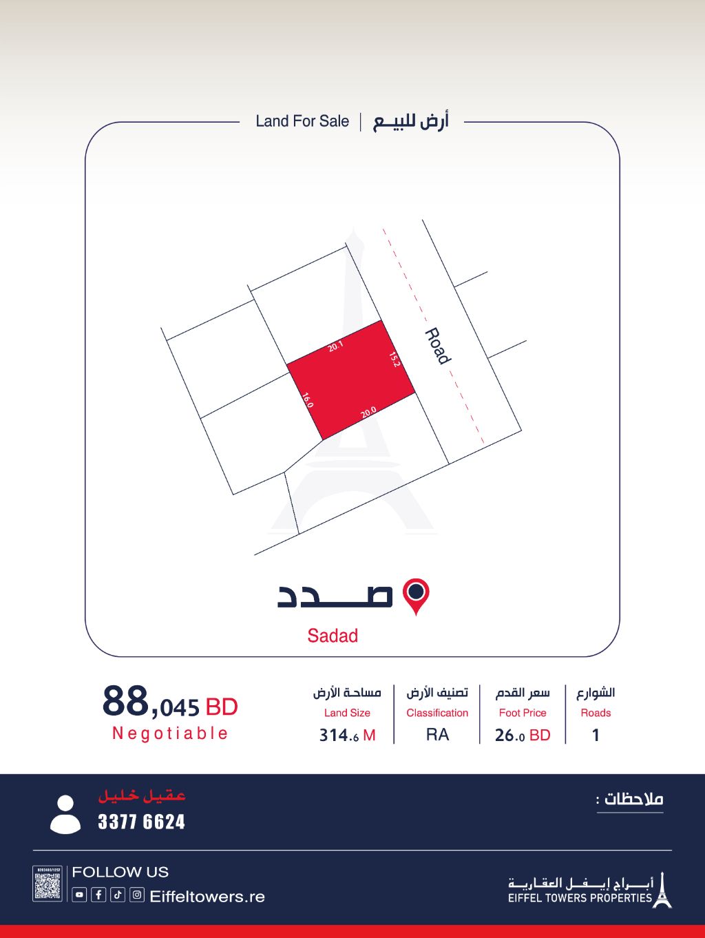 شركة أبراج أيفل العقارية تعرض للبيع أرضاً في صدد، مساحتها 314.6 متر مربع، مصنفة كسكن خاص (أ RA). سعر القدم المربع 26 دينار بحريني، والسعر الإجمالي 88,045 دينار بحريني. للتواصل: عقيل خليل، eiffeltowers.re، eiffeltowers.re، وسيط معتمد من قبل مؤسسة التنظيم العقاري، رقم الترخيص B202403/1257.