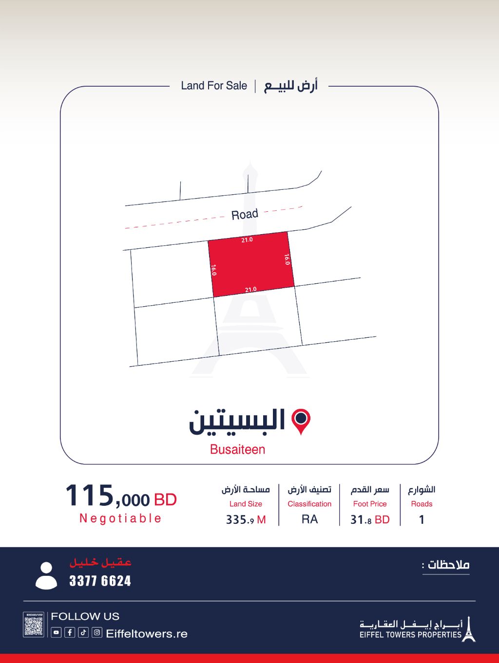 شركة أبراج أيفل العقارية تعرض للبيع أرضاً في البسيتين بمساحة 335.9 متر مربع. التصنيف: سكن خاص (أ RA). سعر القدم المربع: 31.8 دينار بحريني. السعر الإجمالي: 115,000 دينار بحريني. للتواصل: عقيل خليل. شركة أبراج أيفل العقارية وسيط معتمد من قبل مؤسسة التنظيم العقاري، رقم الترخيص B202403/1257.