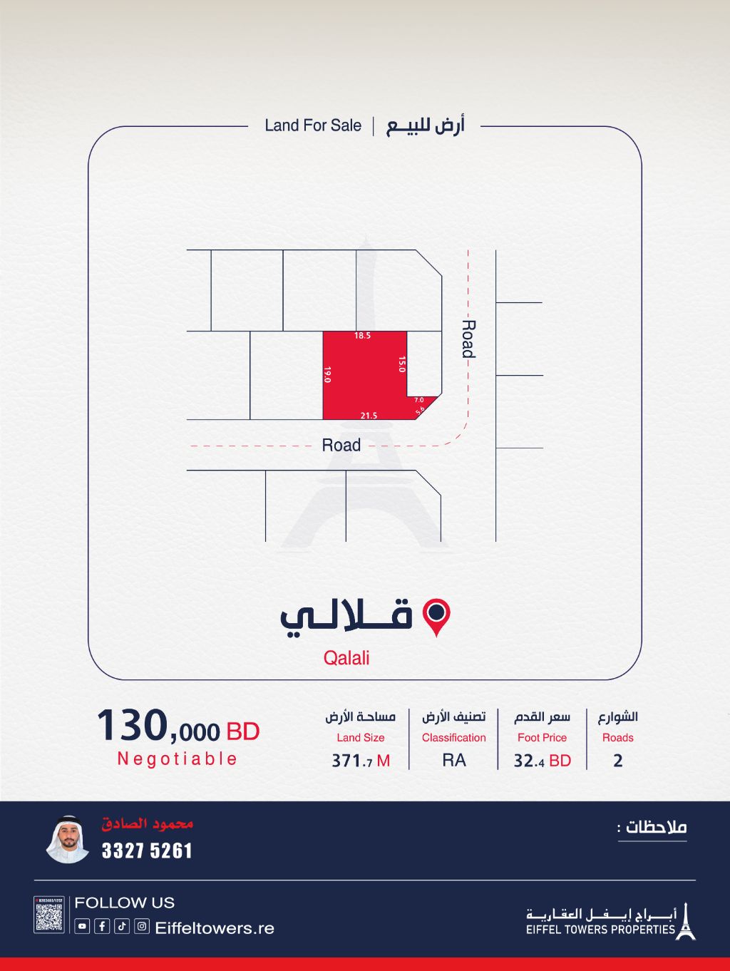 شركة أبراج أيفل العقارية تعرض للبيع أرضاً في قلالي بمساحة 371.7 متر مربع، مصنفة كسكن خاص (أ RA). سعر القدم المربع 32.4 دينار بحريني، السعر الإجمالي 130,000 دينار بحريني. للتواصل: محمود الصادق، eiffeltowers-re، eiffeltowers.re، وسيط معتمد من قبل مؤسسة التنظيم العقاري، رقم الترخيص B202403/1257.