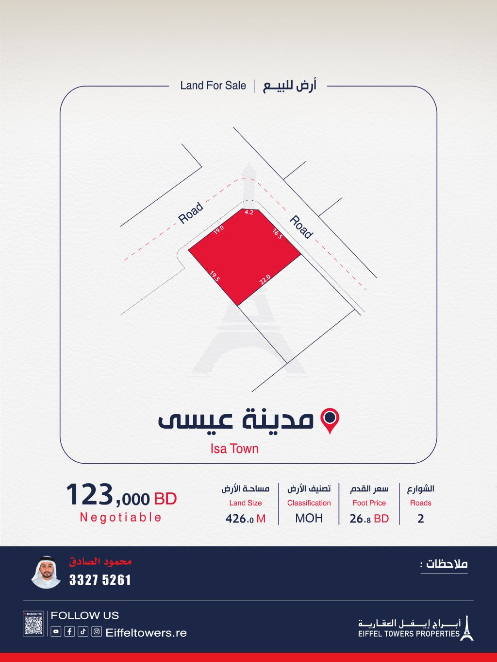 شركة أبراج أيفل العقارية تعرض للبيع أرضاً في مدينة عيسى بمساحة 426 متراً مربعاً. التصنيف: مشاريع الإسكان - وزارة الإسكان. سعر القدم المربع: 26.8 دينار بحريني. السعر الإجمالي: 123,000 دينار بحريني. للتواصل: محمود الصادق، eiffeltowers.re، eiffeltowers.re. وسيط مرخص ومعتمد من قبل مؤسسة التنظيم العقاري، رقم الترخيص B202403/1257.