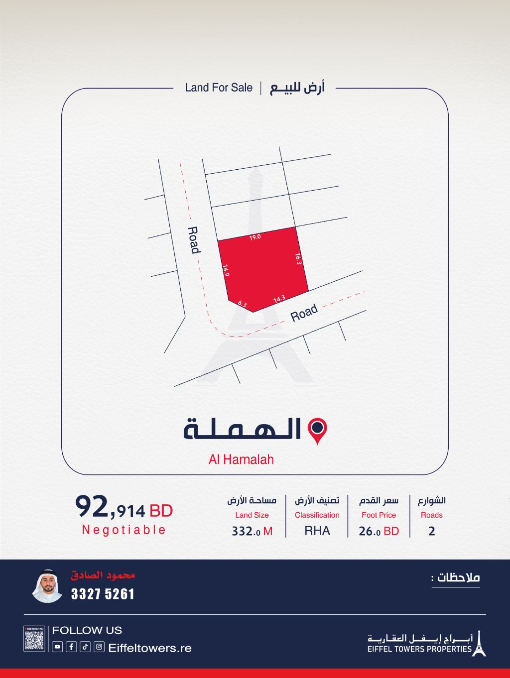 شركة أبراج أيفل العقارية تعرض للبيع أرضاً في الهملة بمساحة 332 متر مربع، مصنفة كسكن متصل (RHA). سعر القدم المربع هو 26 دينار بحريني، والسعر الإجمالي هو 92,914 دينار بحريني. للتواصل: محمود الصادق، eiffeltowers.re، eiffeltowers.re، وسيط معتمد من قبل مؤسسة التنظيم العقاري برقم الترخيص B202403/1257.