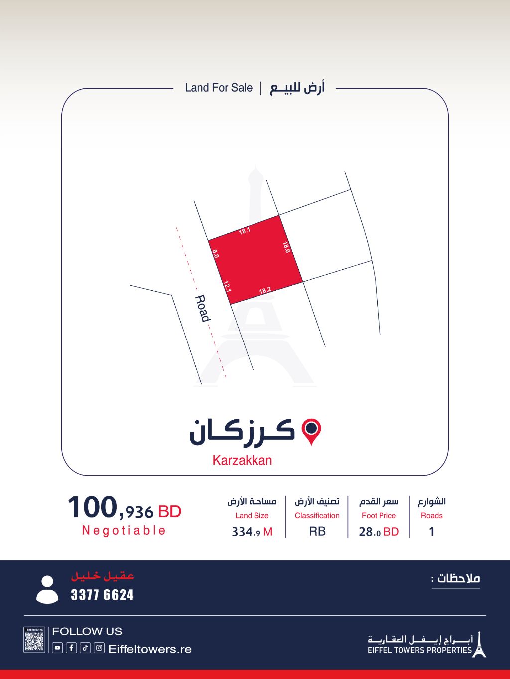 شركة أبراج أيفل العقارية تعرض للبيع أرضاً في كرزكان بمساحة 334.9 متر مربع، مصنفة كسكن خاص (ب Rb). سعر القدم المربع هو 28 دينار بحريني، والسعر الإجمالي هو 100,936 دينار بحريني. للتواصل، اتصل بعقيل خليل على eiffeltowers.re، وهو وسيط معتمد من قبل مؤسسة التنظيم العقاري برقم الترخيص B202403/1257.