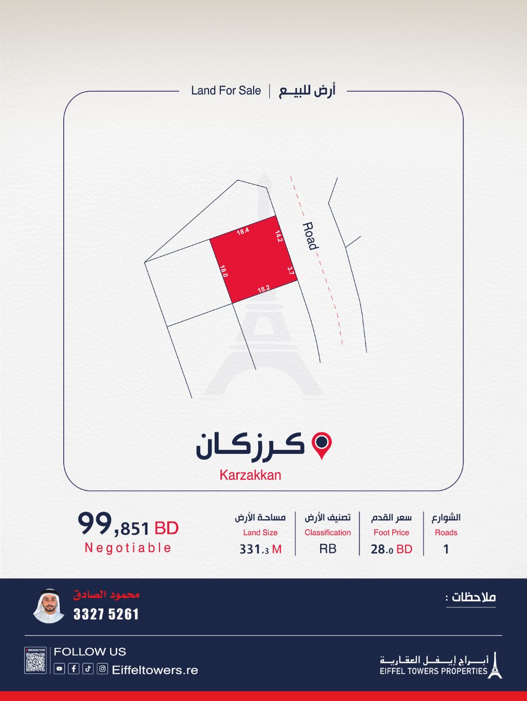 شركة أبراج أيفل العقارية تعرض للبيع أرضاً في كرزكان بمساحة 331.3 متر مربع، مصنفة كسكن خاص (ب Rb). سعر القدم المربع هو 28 دينار بحريني، والسعر الإجمالي هو 9,899,851.675 دينار بحريني. للتواصل، اتصل بمحمود الصادق عبر eiffeltowers-re أو eiffeltowers.re، وسيط معتمد من قبل مؤسسة التنظيم العقاري برقم الترخيص B202403/1257.