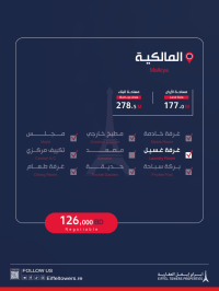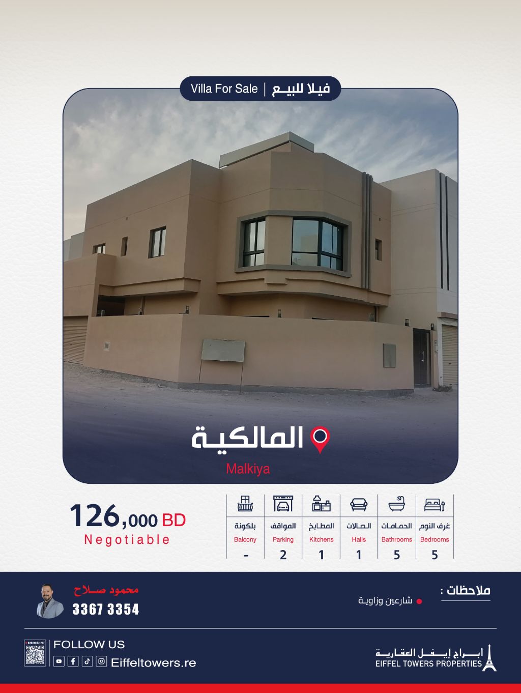 شركة أبراج أيفل العقارية تعرض فيلا للبيع في المالكية. مساحة الأرض: 177 متر مربع. مساحة البناء: 278.5 متر مربع. تفاصيل الفيلا: 5 غرف نوم، 1 صالة، 1 مطبخ، 5 دورات مياه، 2 موقف سيارات، غرفة تبديل، غرفة غسيل. تقع على شارعين وزاوية، بالقرب من جميع الخدمات. السعر الإجمالي: 126,000 دينار بحريني. للتواصل: محمود صلاح، eiffeltowers.re، eiffeltowers.re. وسيط مرخص ومعتمد من قبل مؤسسة التنظيم العقاري، رقم الترخيص B202403/1257.