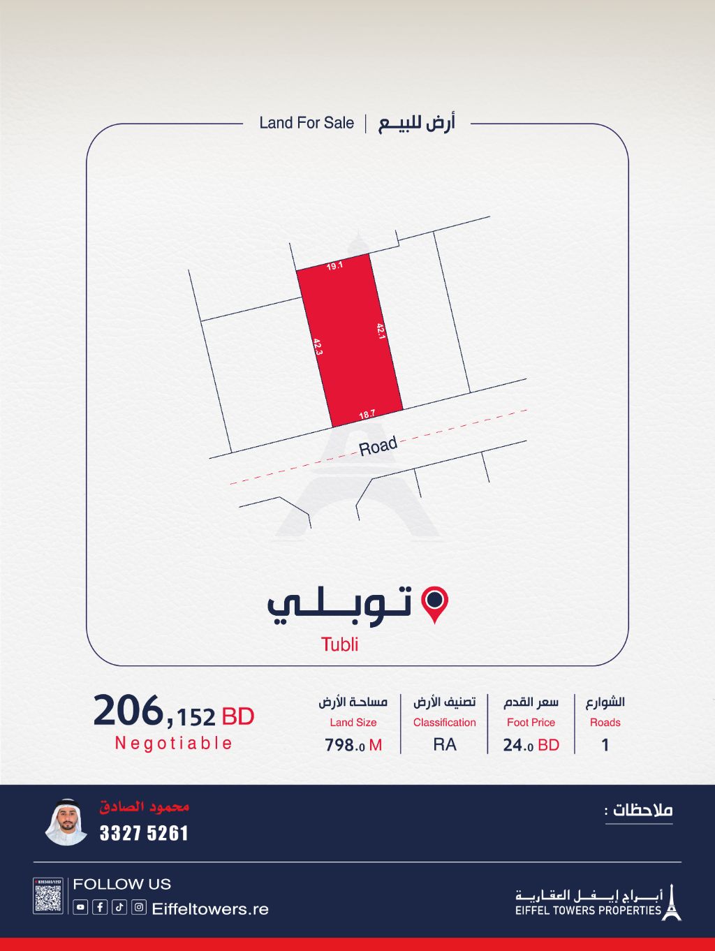 شركة أبراج أيفل العقارية تعرض للبيع أرضاً في توبلي بمساحة 798 متر مربع، مصنفة كسكن خاص (أ RA). سعر القدم المربع 24 دينار بحريني، والسعر الإجمالي 206,152 دينار بحريني. للتواصل: محمود الصادق، eiffeltowers-re، eiffeltowers.re، وسيط مرخص من قبل مؤسسة التنظيم العقاري برقم الترخيص B202403/1257.