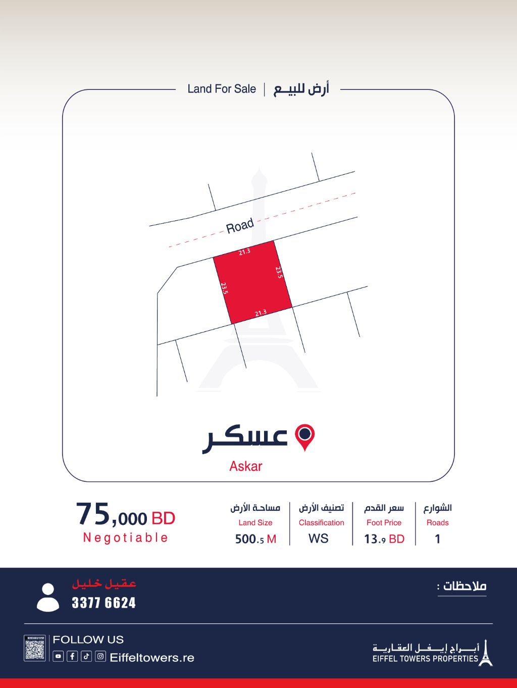 شركة أبراج أيفل العقارية تعرض للبيع أرضاً في عسكر بمساحة 500.5 متر مربع، مصنفة WS، بسعر القدم 13.9 دينار بحريني والسعر الإجمالي 75,000 دينار بحريني. للتواصل، عقيل خليل، eiffeltowers.re، وسيط معتمد من قبل مؤسسة التنظيم العقاري برقم الترخيص B202403/1257.