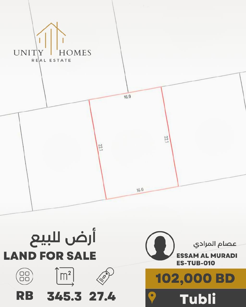 للبيع: أرض سكنية استثمارية في توبلي. موقع ممتاز قريب من مركز حسن محمو التجاري. التصنيف أر بي. المساحة 345.3 متر مربع. سعر القدم المربع: 27.4 دينار بحريني. إجمالي سعر البيع: 102,000 دينار بحريني. قابل للتفاوض.