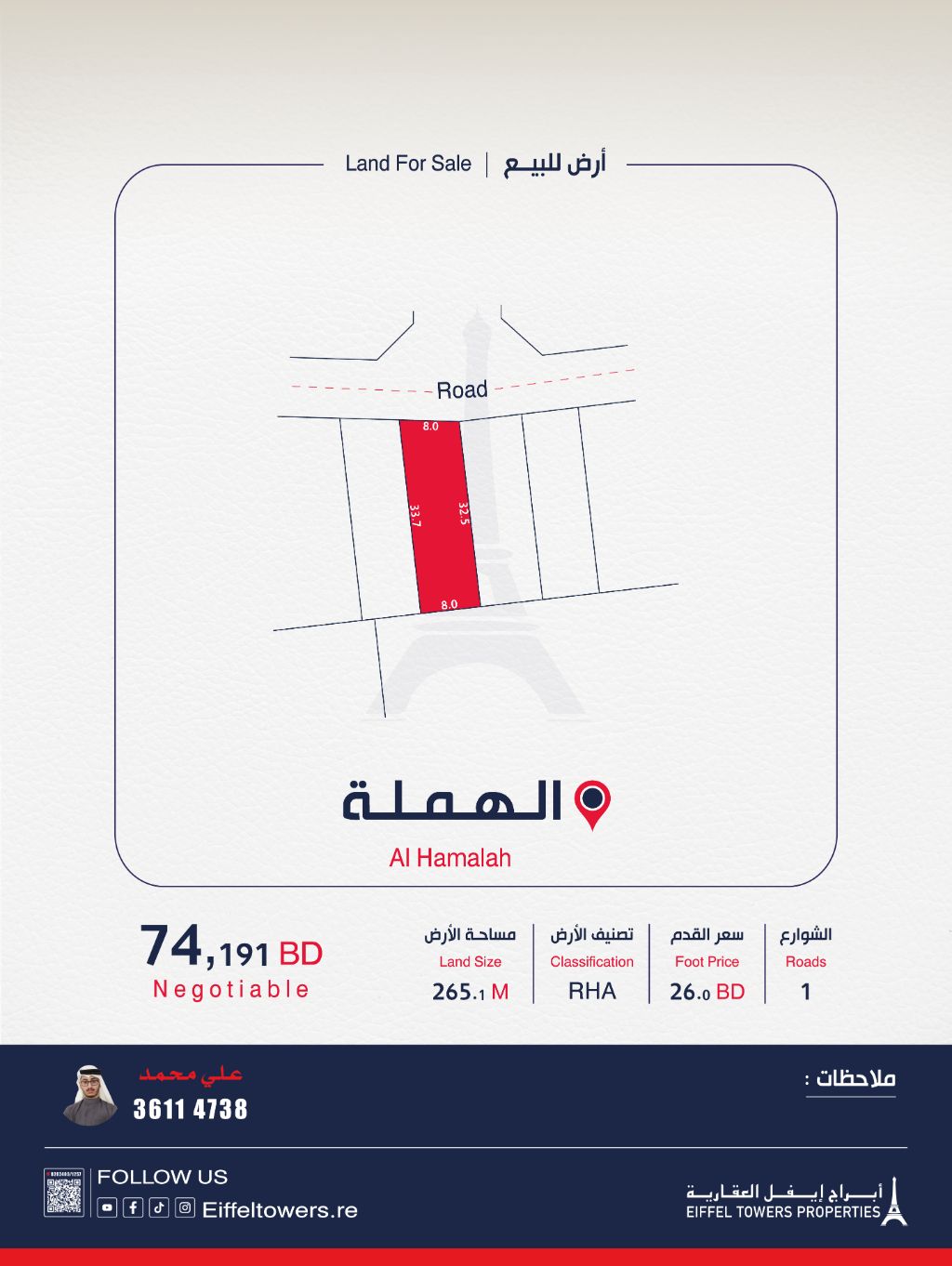شركة أبراج أيفل العقارية تعرض للبيع أرضاً في الهملة بمساحة 265.1 متر مربع. التصنيف: سكني متصل (RHA). سعر القدم المربع: 26 دينار بحريني. السعر الإجمالي: 74,191 دينار بحريني. للتواصل: علي محمد. الموقع الإلكتروني: eiffeltowers.re. وسيط مرخص ومعتمد من قبل مؤسسة التنظيم العقاري، رقم الترخيص B202403/1257.