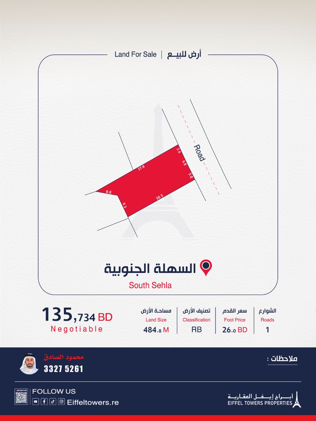 شركة أبراج أيفل العقارية تعرض للبيع أرضاً في السهلة الجنوبية. المساحة 484.8 متر مربع، مصنفة كسكن خاص (RB). سعر القدم المربع 26 دينار بحريني، والسعر الإجمالي 135,734 دينار بحريني. للتواصل، اتصل بمحمود الصادق عبر eiffeltowers.re. الشركة وسيط معتمد مرخص من قبل مؤسسة التنظيم العقاري برقم الترخيص B202403/1257.