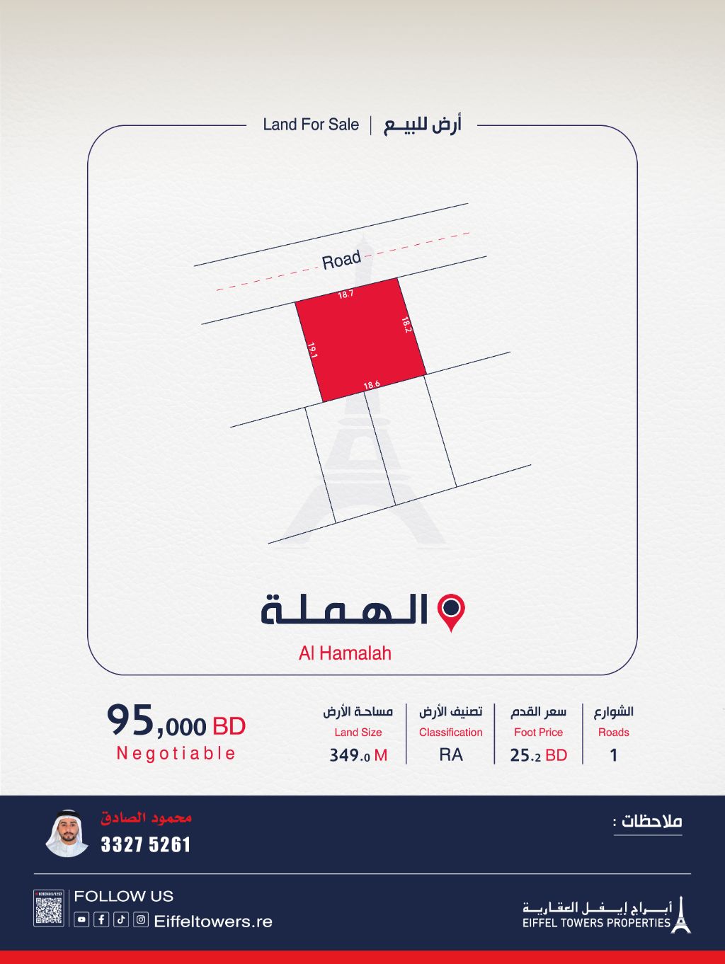 شركة أبراج أيفل العقارية تقدم أرضاً للبيع في الهملة. المساحة 349 متر مربع. التصنيف سكن خاص (أ RA). سعر القدم المربع 25.2 دينار بحريني. السعر الإجمالي 95,000 دينار بحريني. للتواصل: محمود الصادق، eiffeltowers.re، eiffeltowers.re. الشركة وسيط معتمد من قبل مؤسسة التنظيم العقاري، رقم الترخيص B202403/1257.
