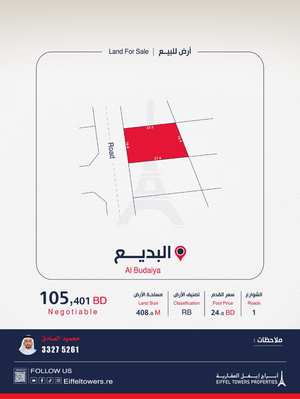 شركة أبراج أيفل العقارية تعرض للبيع أرضاً في البديع بمساحة 408 متر مربع، مصنفة كسكن خاص (RB). سعر القدم المربع هو 24 دينار بحريني، والسعر الإجمالي هو 105,401 دينار بحريني. للتواصل، اتصل بمحمود الصادق عبر eiffeltowers.re. الشركة وسيط معتمد من قبل مؤسسة التنظيم العقاري، برقم الترخيص B202403/1257.
