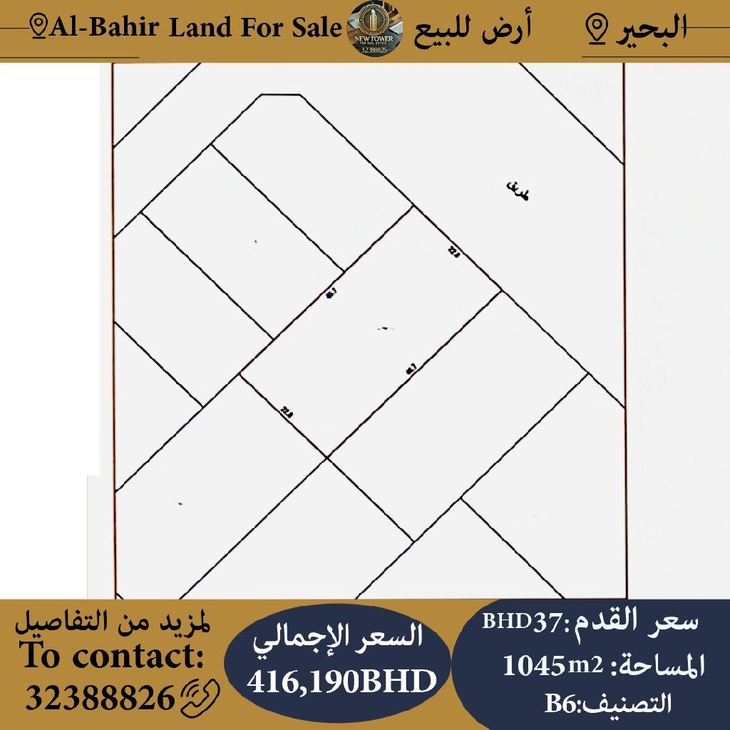 للبيع أرض استثمارية في البحير - تصنيف B6، مساحة الأرض 1045.1 متر مربع، سعر القدم 37 دينار بحريني (قابل للتفاوض)، السعر الإجمالي 416,190 دينار بحريني. للتواصل.
