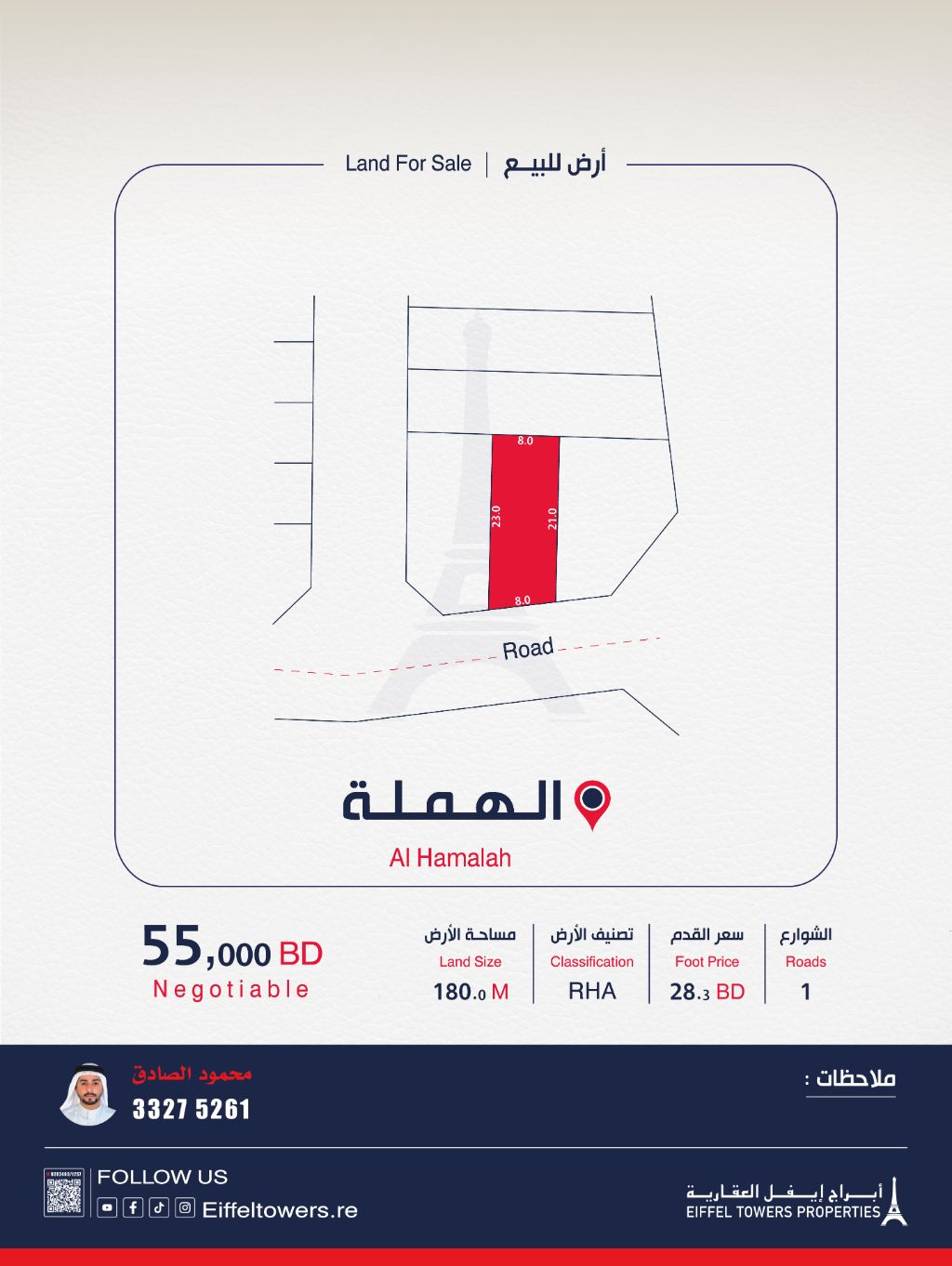 شركة أبراج أيفل العقارية تعرض أرضاً للبيع في الهملة. المساحة 180 متراً مربعاً، التصنيف سكن متصل (أ RHA). سعر القدم المربع 28.3 دينار بحريني، والسعر الإجمالي 55,000 دينار بحريني. للتواصل: محمود الصادق، eiffeltowers.re، eiffeltowers.re، وسيط معتمد من قبل مؤسسة التنظيم العقاري، رقم الترخيص B202403/1257.