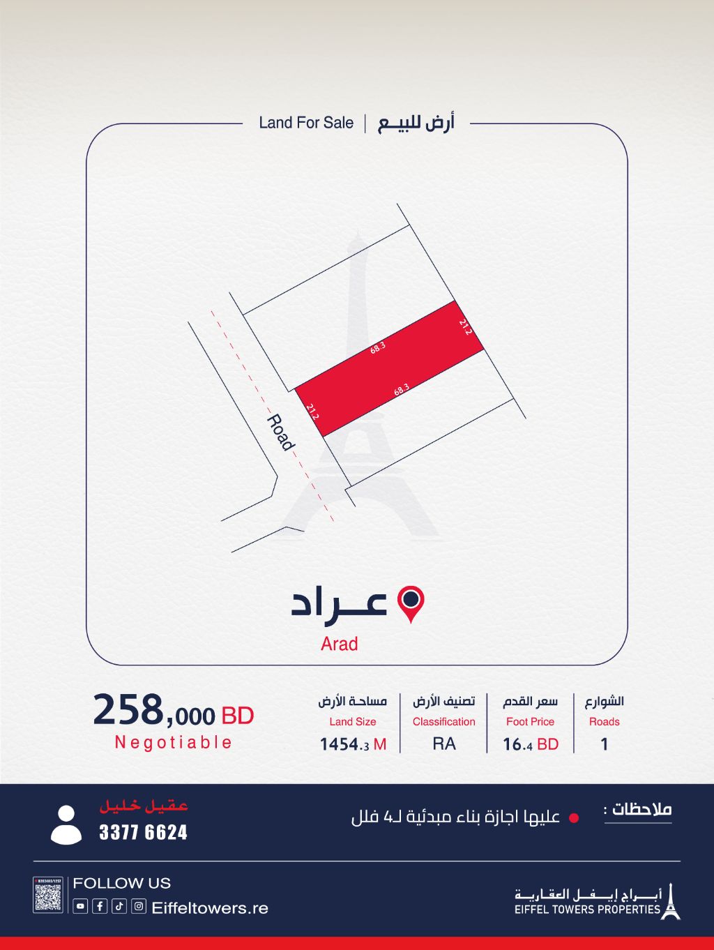 شركة أبراج أيفل العقارية تعرض للبيع أرضاً في عراد بمساحة 1454.3 متر مربع. التصنيف: سكن خاص (RA). سعر القدم: 16.4 دينار بحريني. السعر الإجمالي: 258,000 دينار بحريني. للتواصل: عقيل خليل. شركة أبراج أيفل العقارية وسيط معتمد من قبل مؤسسة التنظيم العقاري، رقم الترخيص B202403/1257.