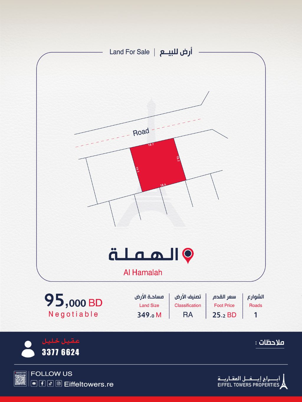 شركة أبراج أيفل العقارية تعرض للبيع أرضاً في الهملة بمساحة 349 متراً مربعاً، مصنفة كسكن خاص (أ RA). سعر القدم المربع هو 25.2 دينار بحريني، والسعر الإجمالي هو 95,000 دينار بحريني. للتواصل، اتصل بعقيل خليل. شركة أبراج أيفل العقارية وسيط معتمد من قبل مؤسسة التنظيم العقاري، رقم الترخيص B202403/1257.
