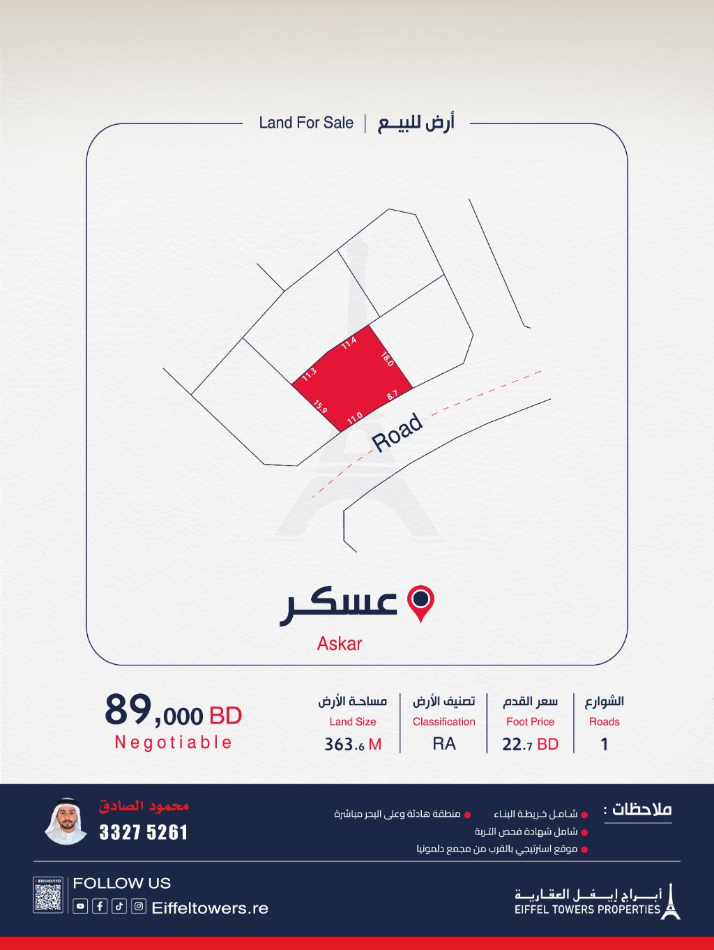 شركة أبراج أيفل العقارية تعرض للبيع أرضاً في عسكر بمساحة 363.6 متر مربع، مصنفة كسكن خاص (أ RA). سعر القدم المربع 22.7 دينار بحريني، السعر الإجمالي 89,000 دينار بحريني، للكاش فقط. للتواصل: محمود الصادق، eiffeltowers.re، eiffeltowers.re، وسيط معتمد من قبل مؤسسة التنظيم العقاري، رقم الترخيص B202403/1257.