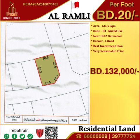 أرض زاوية B3 للبيع في الرملي بالقرب من ايكيا سلماباد، بسعر 20 دينار بحريني للقدم تقع هذه الأرض بالقرب من ايكيا سلماباد، الرملي. مساحة الأرض 614.5 مترا مربعا، وهي أرض زاوية مصنفة B3، ومناسبة لبناء سكني أو تجاري من 3 طوابق. سهولة الوصول الى الطريق السريع توبلي، المنامة، وغيرها. سعر القدم 20 دينار بحريني، ليصبح الاجمالي 132000 دينار بحريني قابل للتفاوض